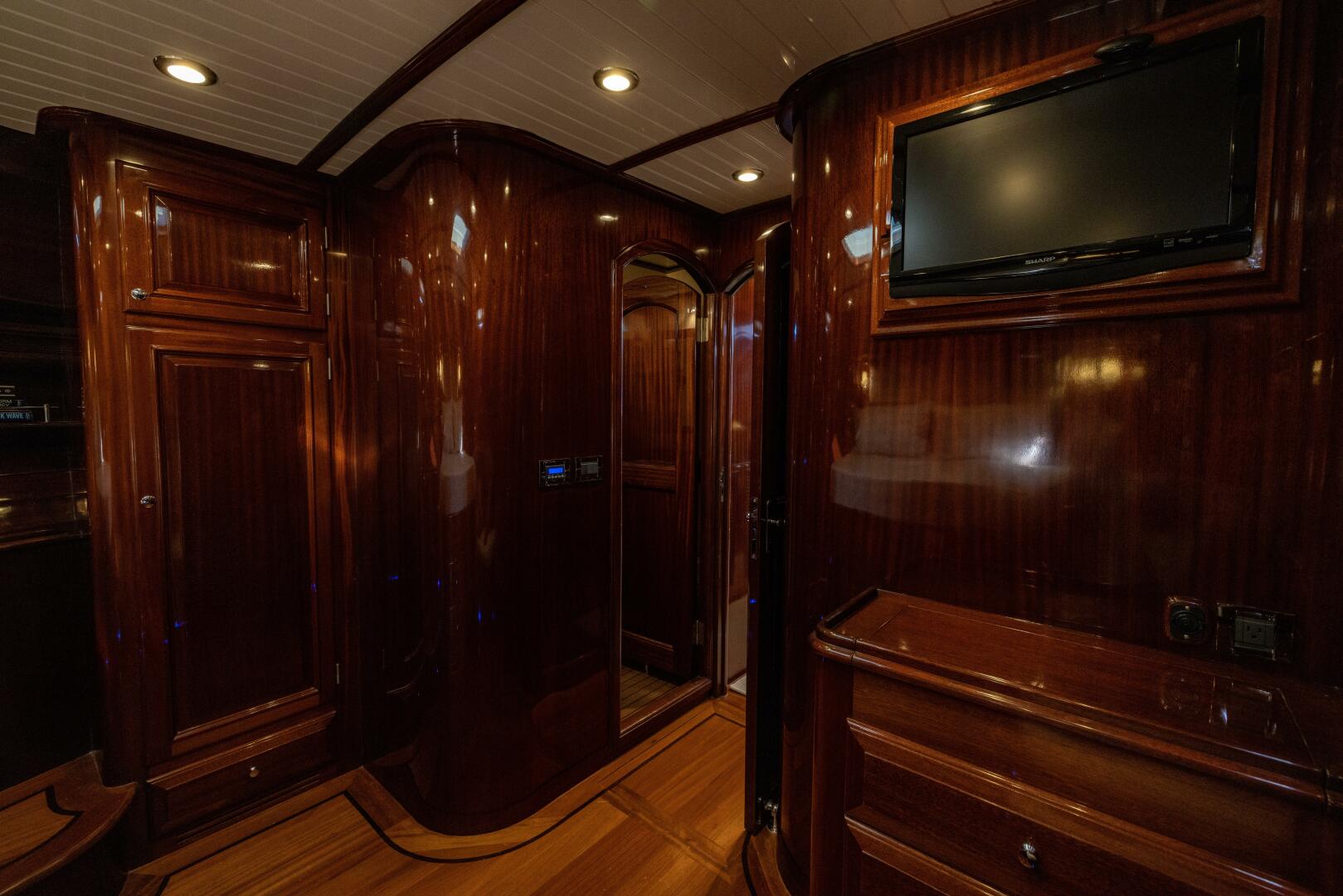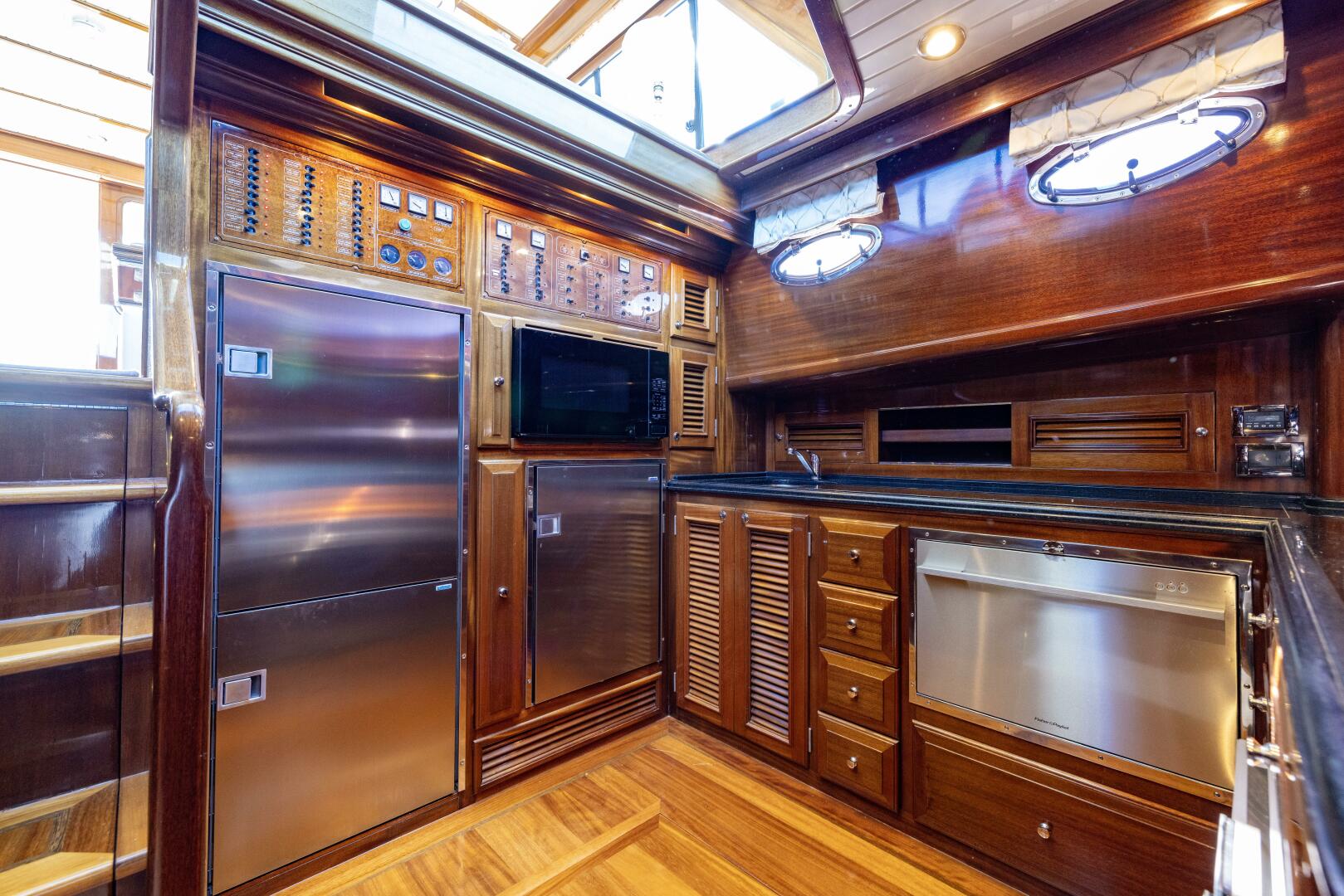 Just four steps down is the galley which has beautiful raised Mahogany and louvered panel doors and drawer storage. There are granite counter tops, two roomy refrigerators and one freezer, a dishwasher, stainless sink and microwave oven. Below the Mahogany floors is an 8 x 2 x 2 storage area allowing you to cast off for an extended trip without restocking for quite a while.
