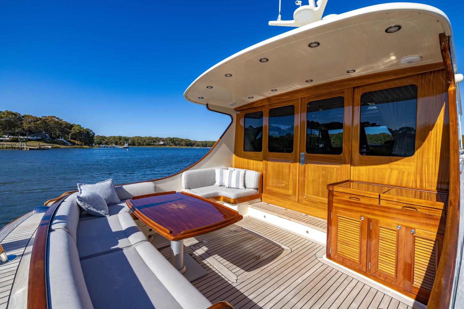 There are two beautiful sofa's port and starboard, a high-glossed Bensenzoni Mahogany high/low table, stereo system, bottle storage, Uline icemaker, and storage everywhere.