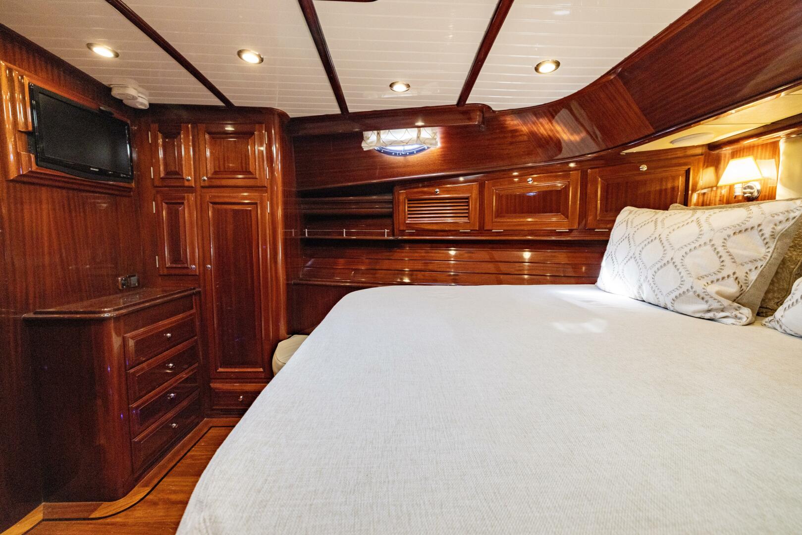 The master stateroom is all the way forward and features a large queen size bed, port and starboard hanging locker, a vanity, abundant drawer storage and an en-suite head with a large stall shower.
