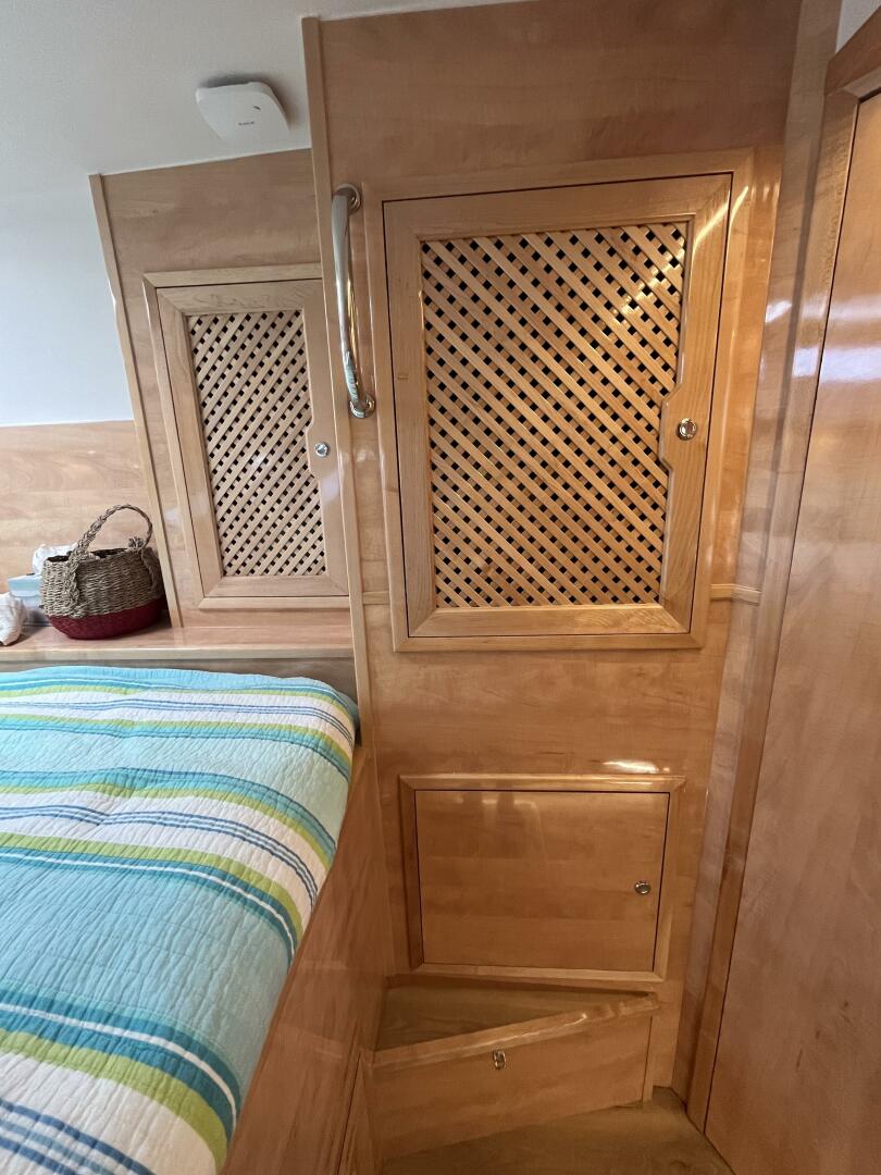 - Large storage lockers with latticed doors, outer and inner hull, foot of the bunk