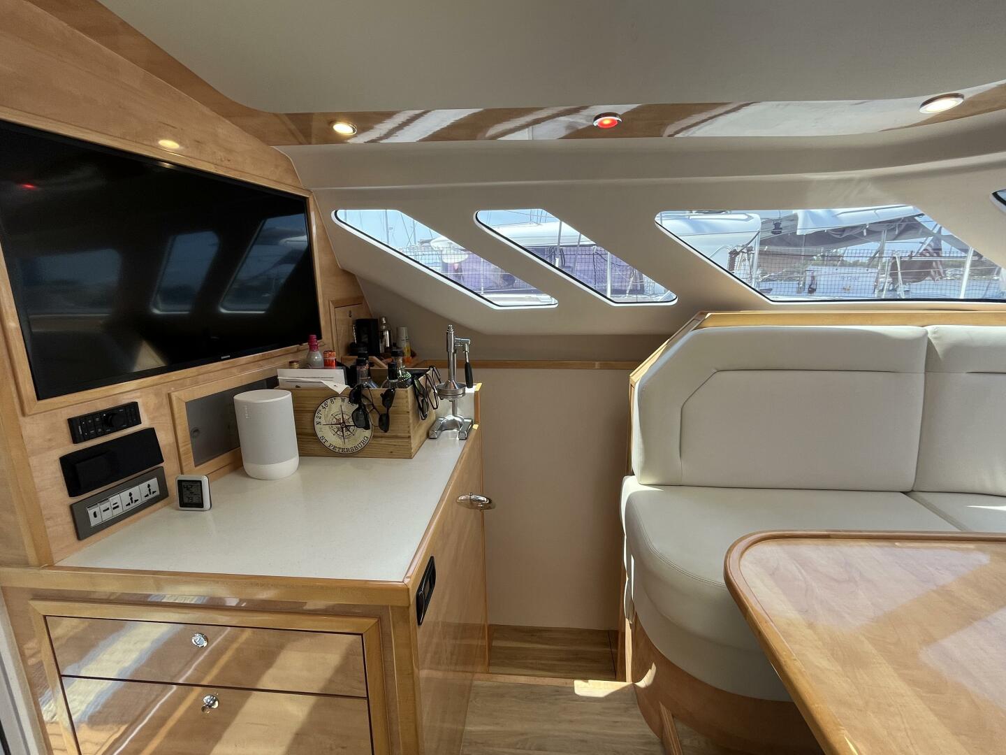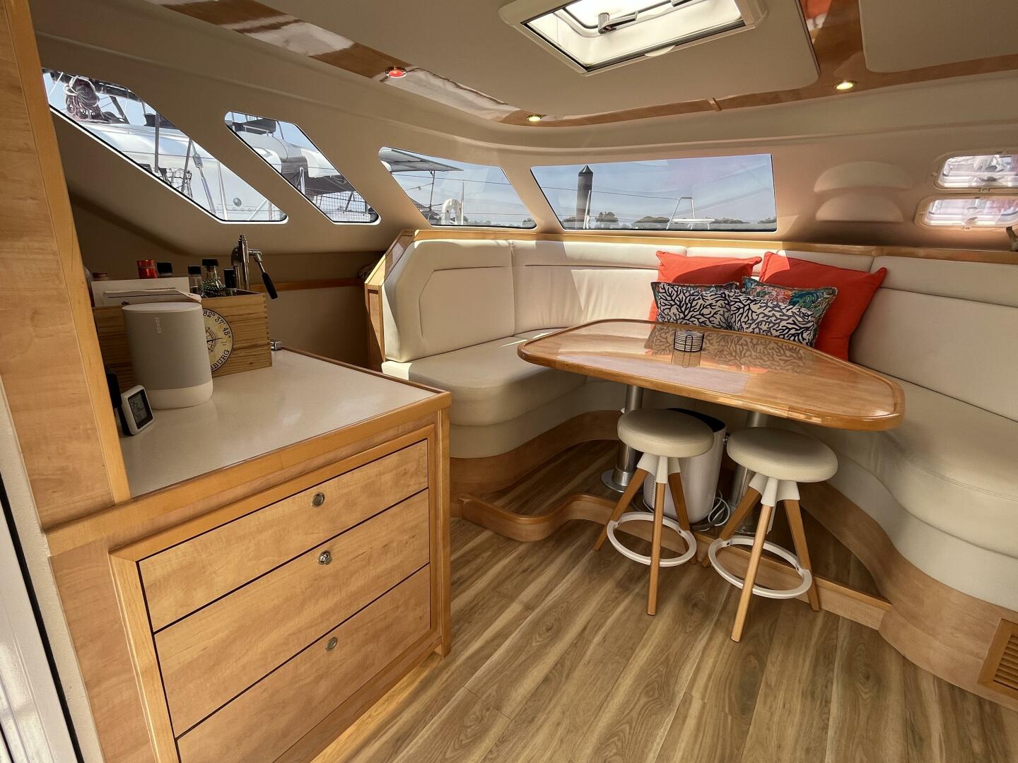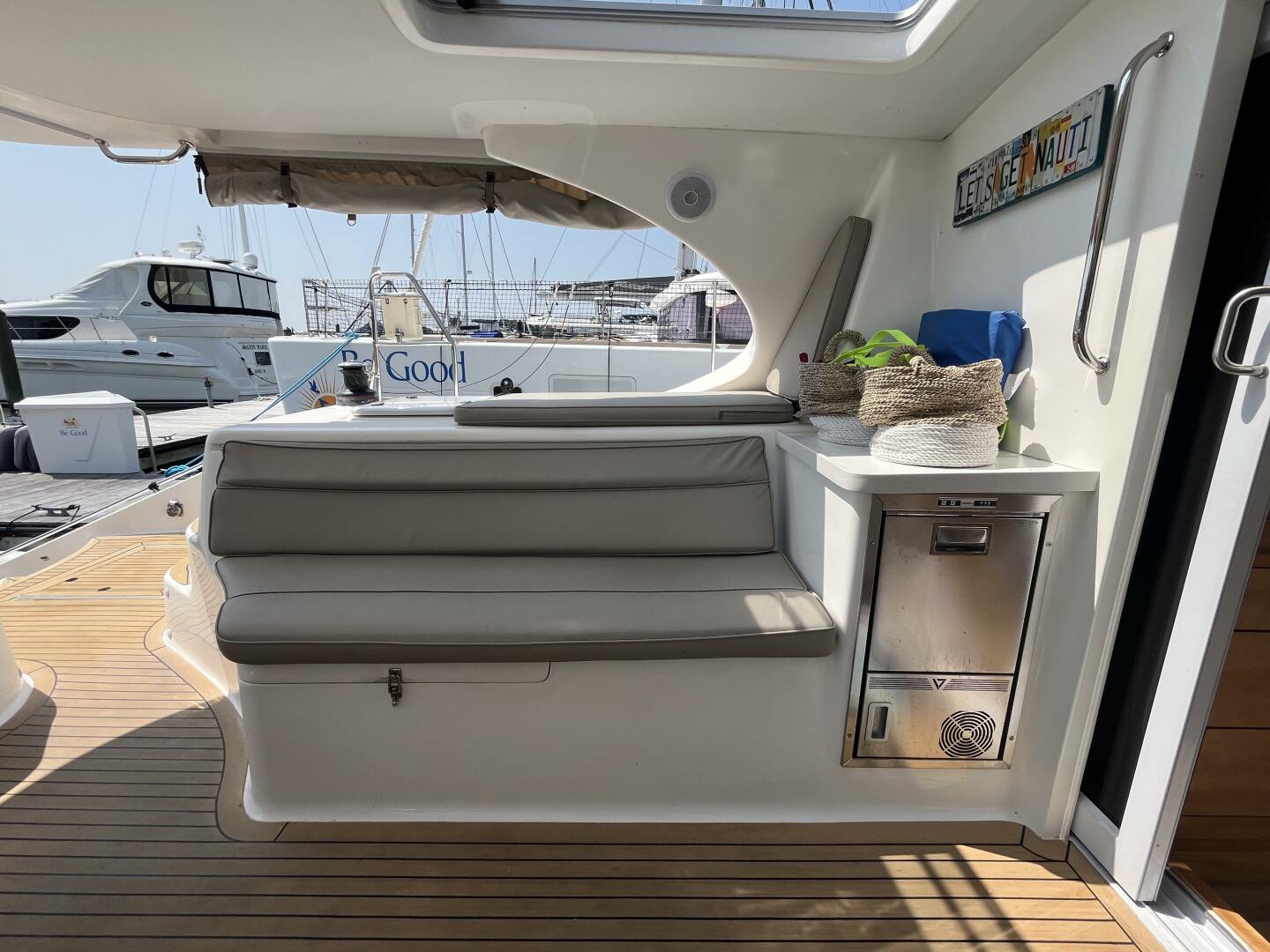 - Aft settee with storage beneath & fiberglass molded back w/ storage beneath