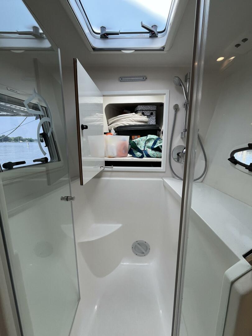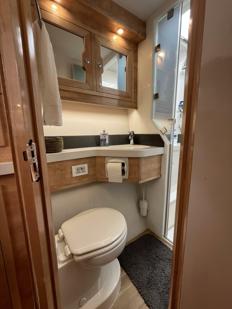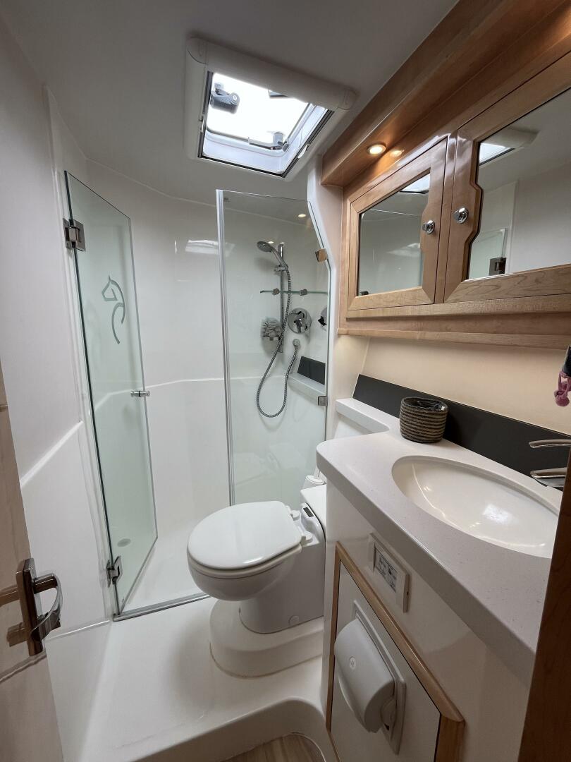 - Central/Jack & Jill stand up shower stall serves fore and aft heads