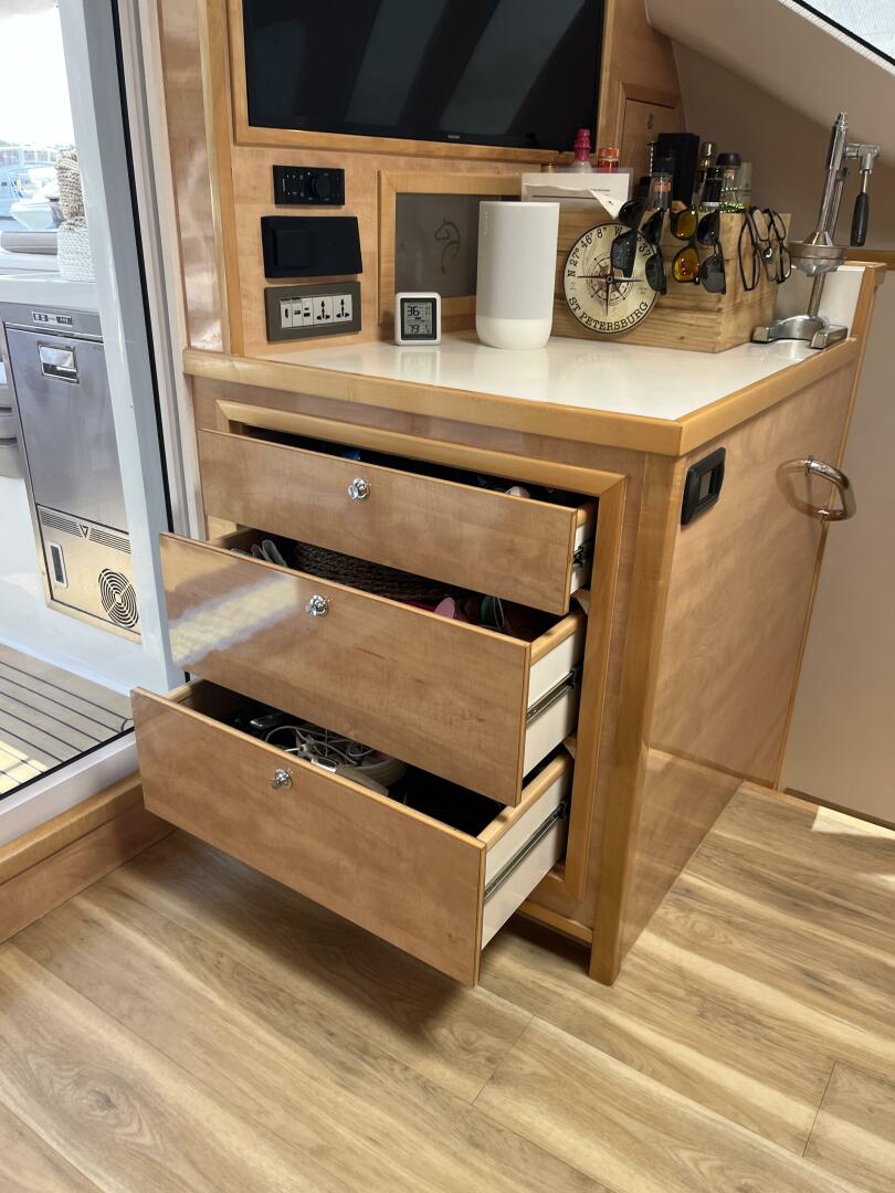 - Storage beneath helm pedestal