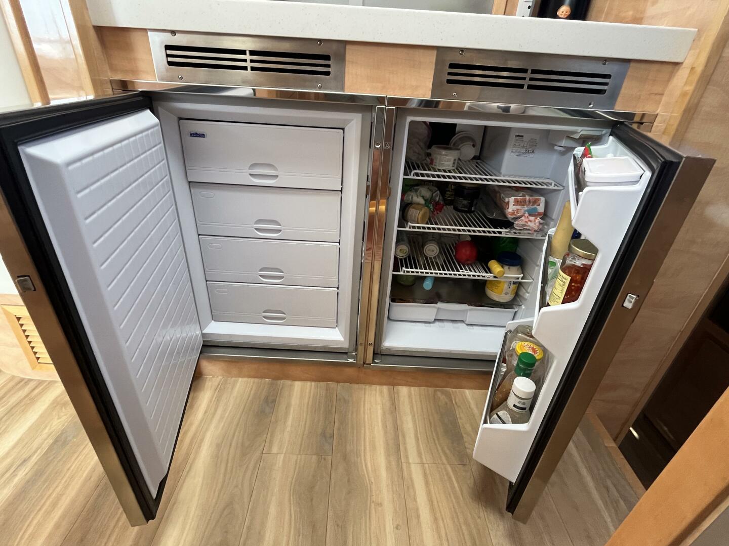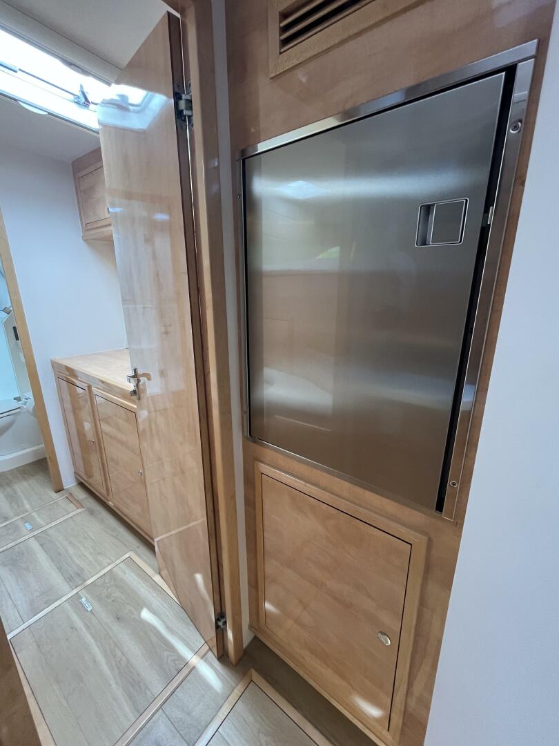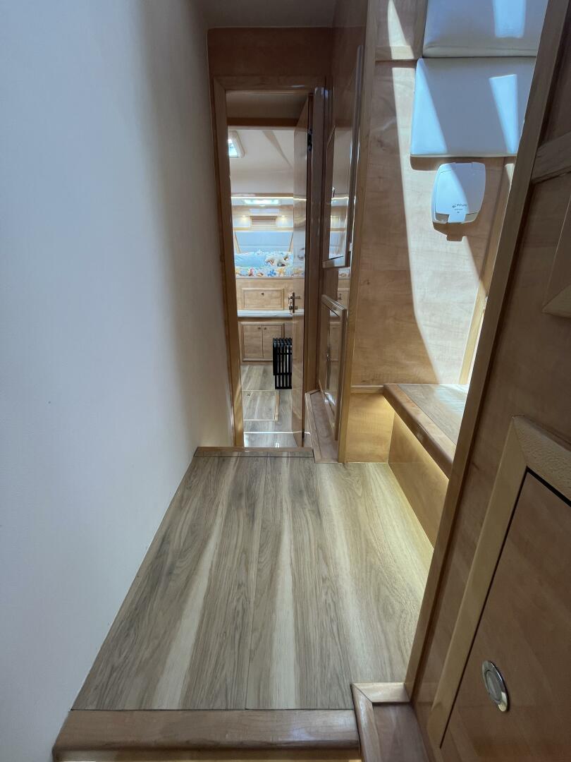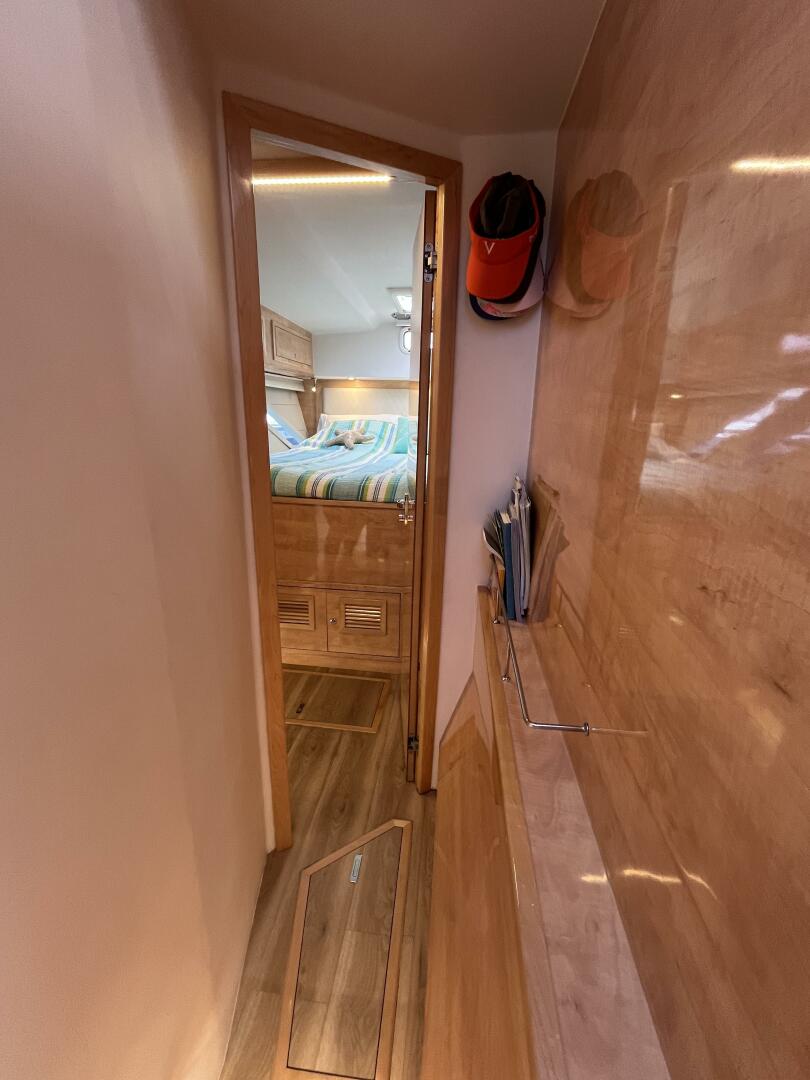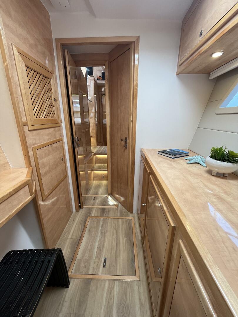 - Large vestibule w/ credenza & overhead lockers along outer hull
