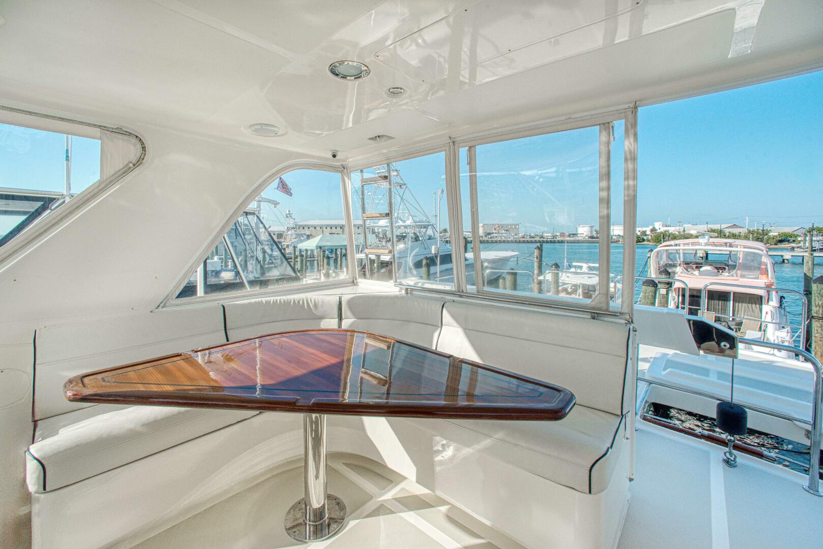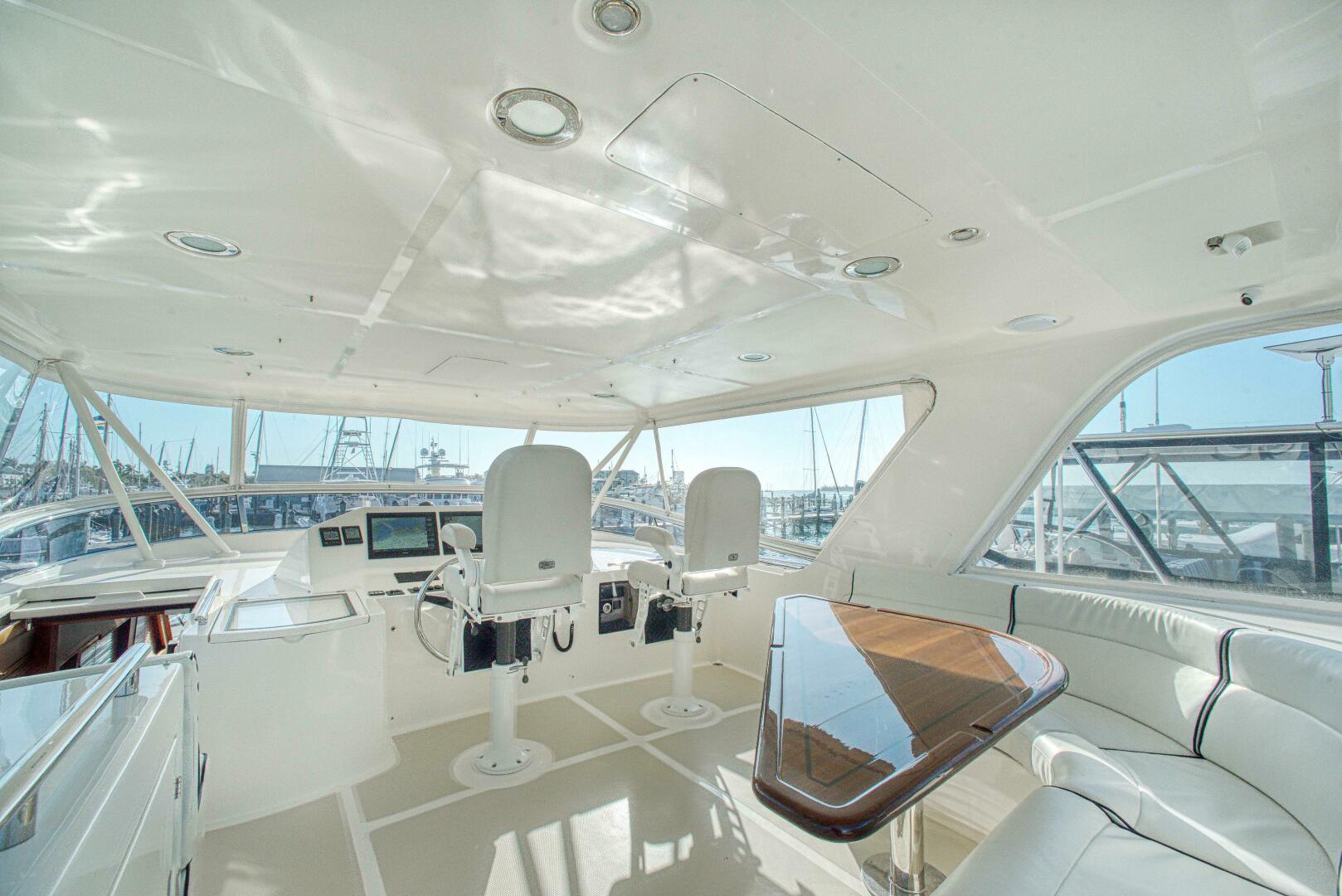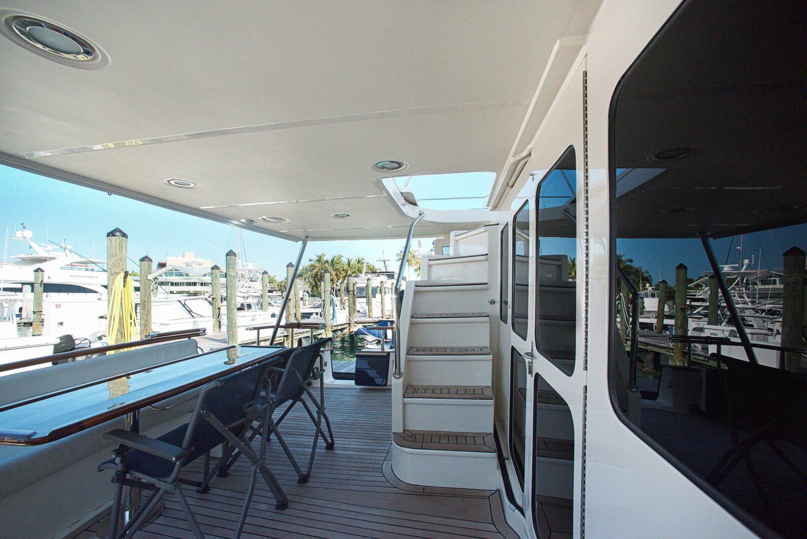 Imagine has a beautiful Flag Blue Awlcraft 2000 hull and Oyster White Gelcoat superstructure. The lower decks are natural teak and the upper deck is non skid for low maintenance. In the cockpit there is a large high gloss teak table that seats 6 with the addition of 3 chairs. The cockpit is protected by wing doors to the side decks. The swim platform has rails for safety and a slide out swim ladder. This yacht has optional forward boarding doors that allow easy access from taller docks.