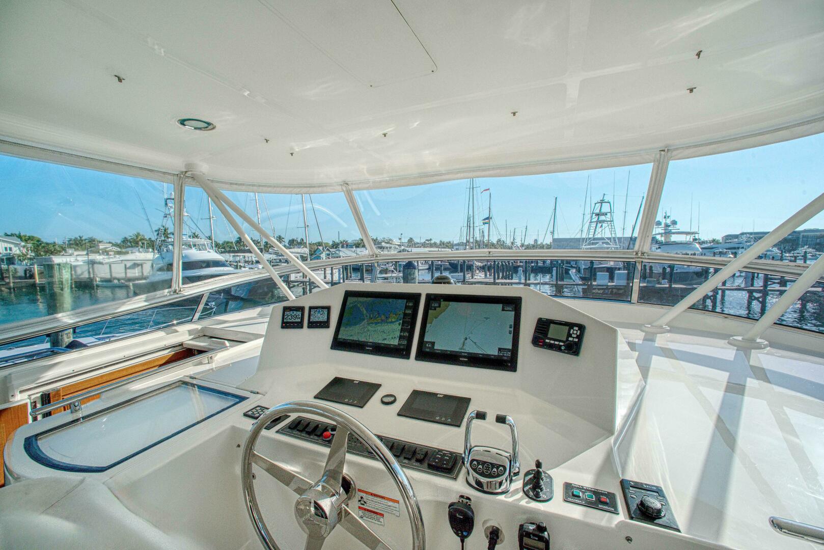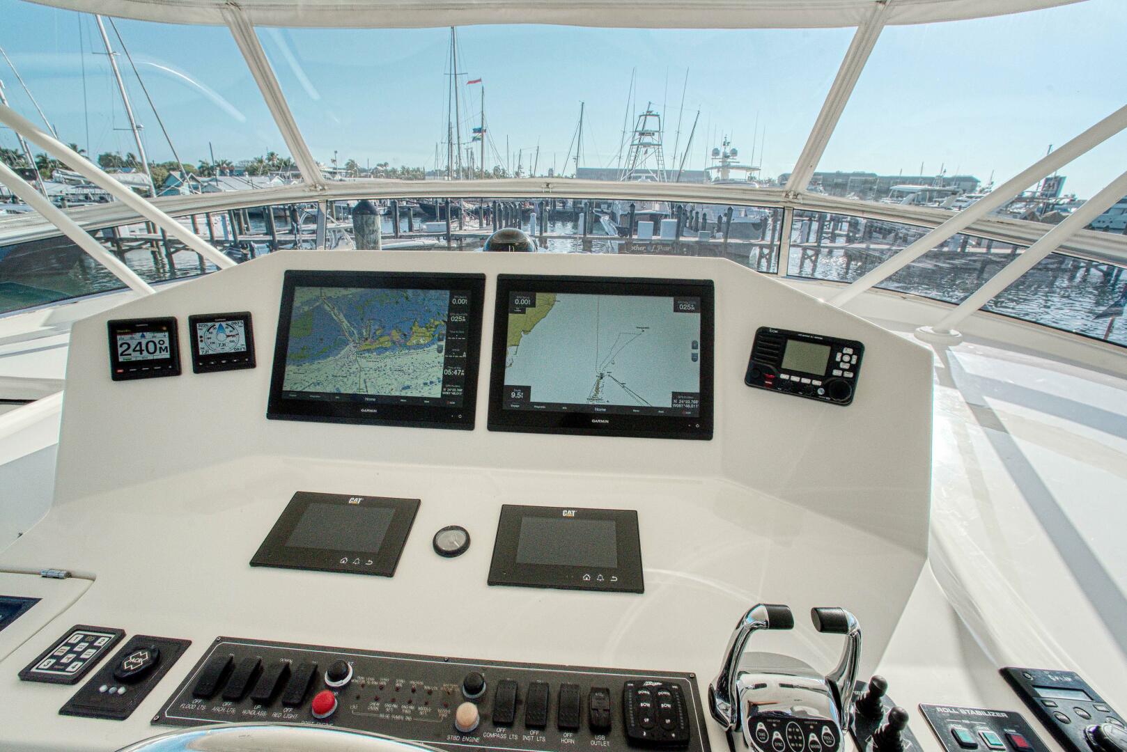 The Fly-bridge provides great views when running the boat or relaxing at anchor or in the marina. This is also a great place to live in while not underway. The large seating and beautiful teak table provide the best views. The twin helm chairs are very comfortable. The Garmin Electronics package is complete with dual 17" screens, 6kw open array radar, sounder module and camera system.