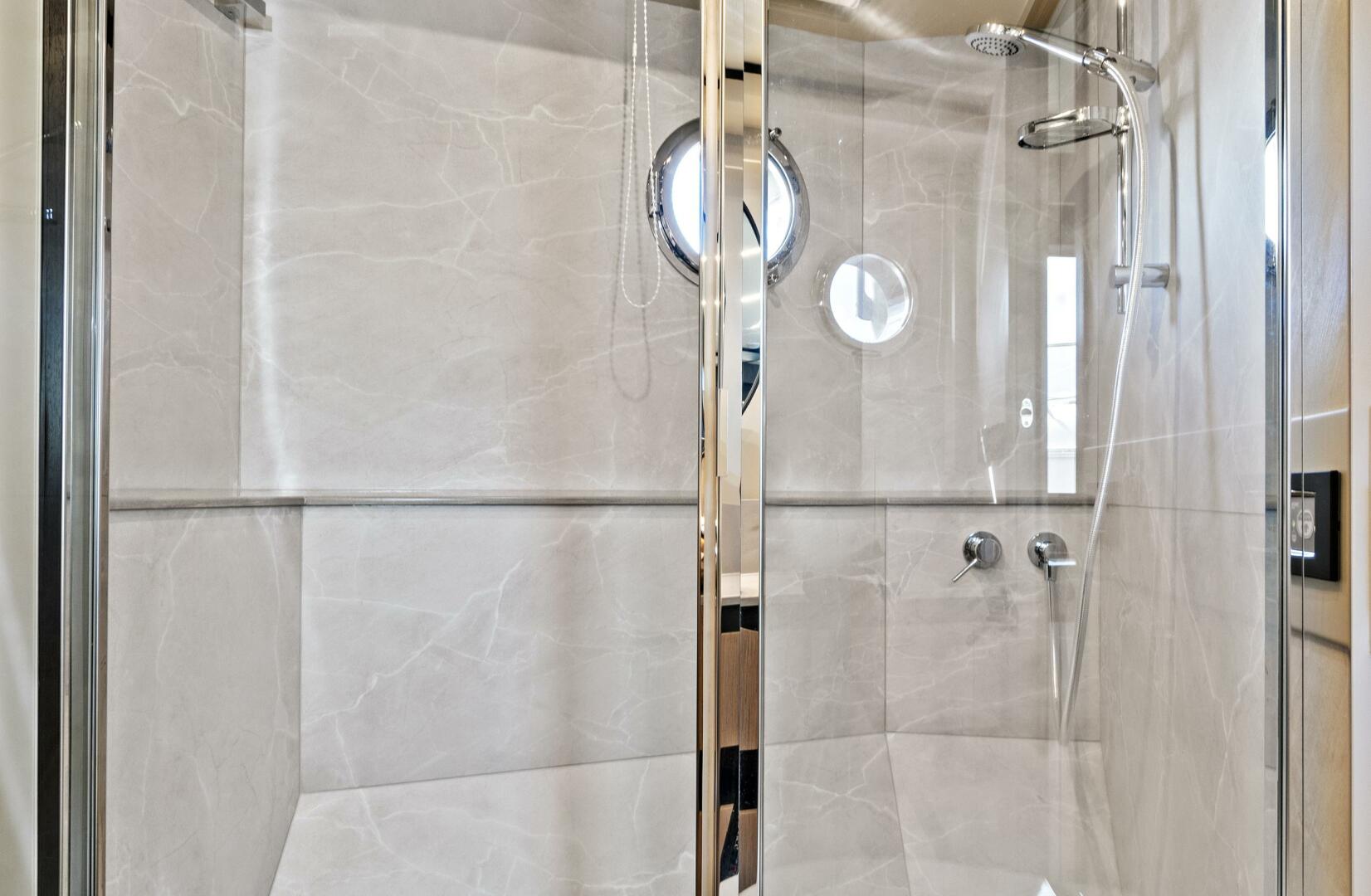 The bow location of the master cabin ensures peace, silence and privacy. Its full-beam layout optimises space, with a large double berth accessible from all three sides, extensive cupboards and storage units, and a superb marble bathroom.