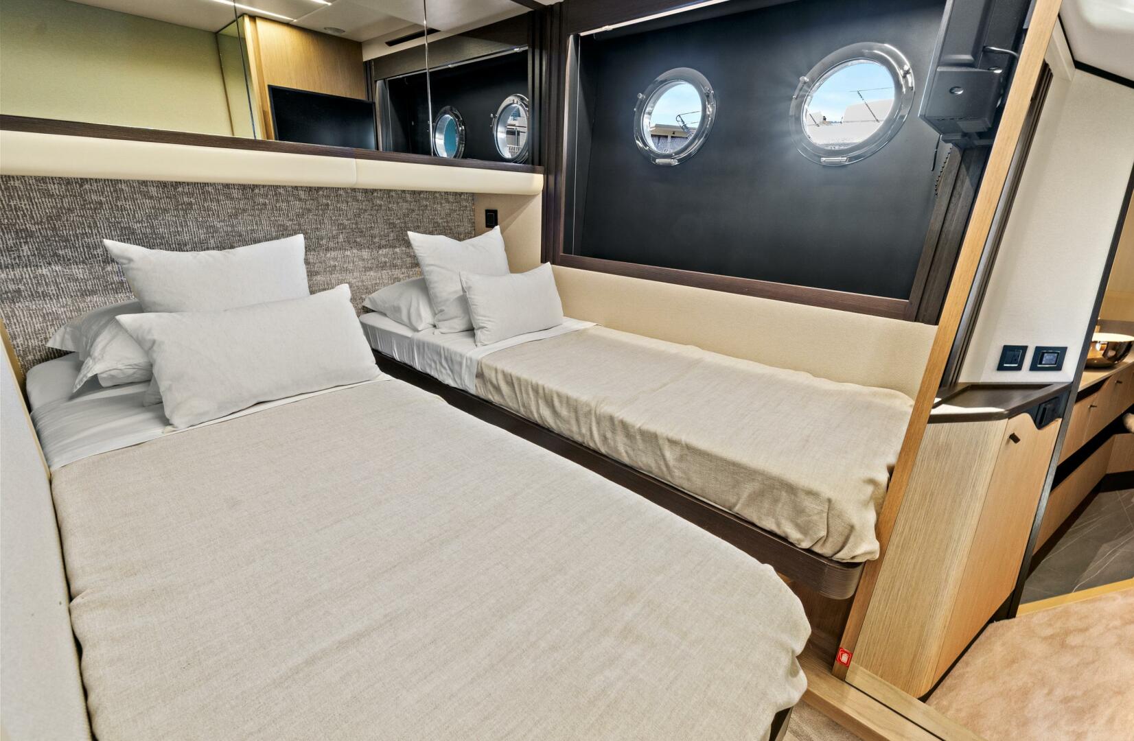The VIP guest cabin midships could in every way be considered a second master, in terms of space, headroom, en-suite bathroom and finish. The third guest cabin has an electricalsystem, fitted as standard, for seamless transformation from twin berths to double. In addition, there is a versatile crew cabin, with practical access from the stern platform.