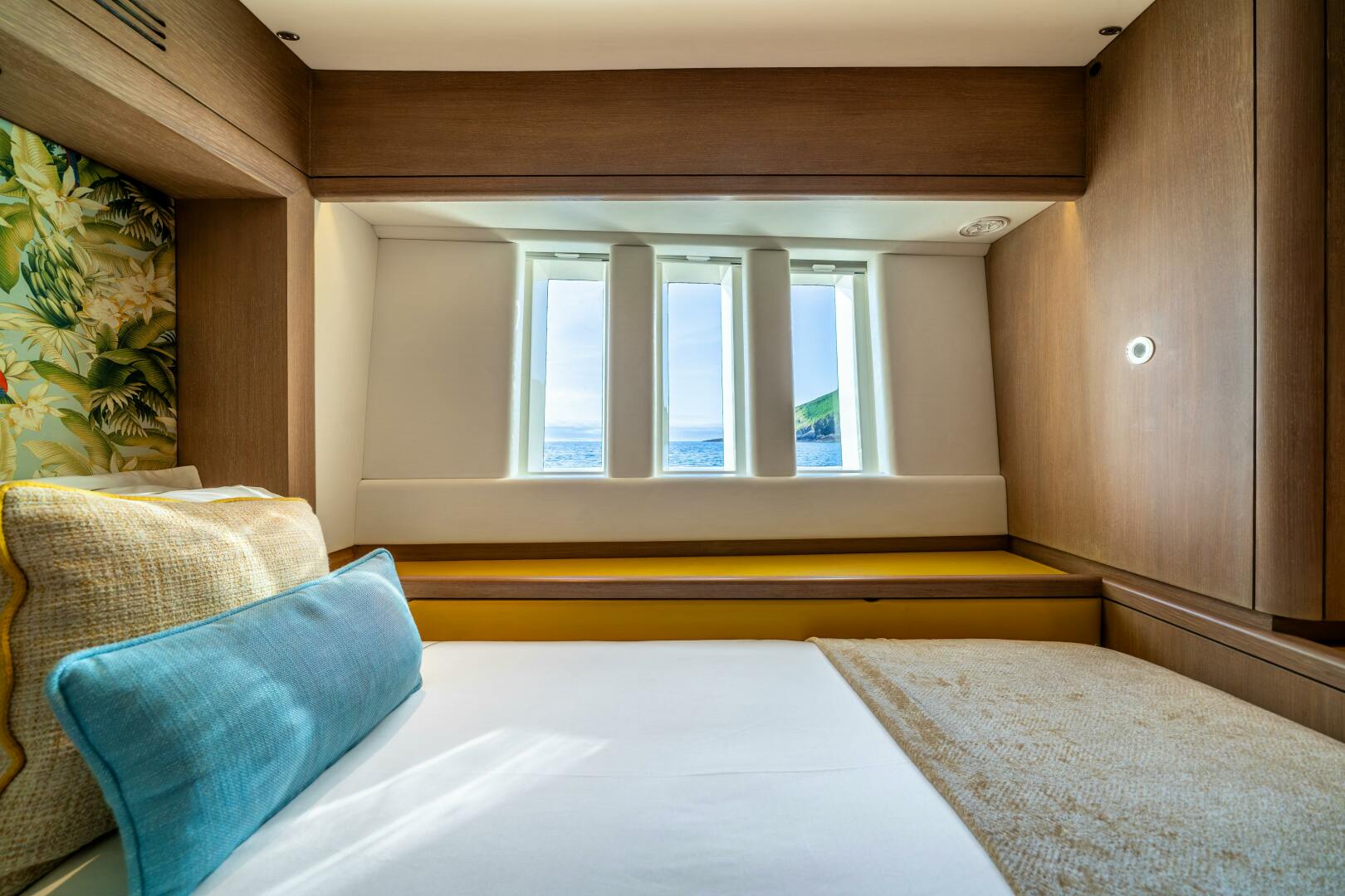 One of her many features is a split cockpit – perfect for al fresco dining and relaxation underway – and her spacious, open deck areas, extended by a large hydraulic bathing platform to give easy access to the water for swimming and boarding the tender. The main tender is stored in a well on the foredeck which, with the tender in the water, becomes a recessed lounge area complete with a brightly coloured sun pad and cushions.