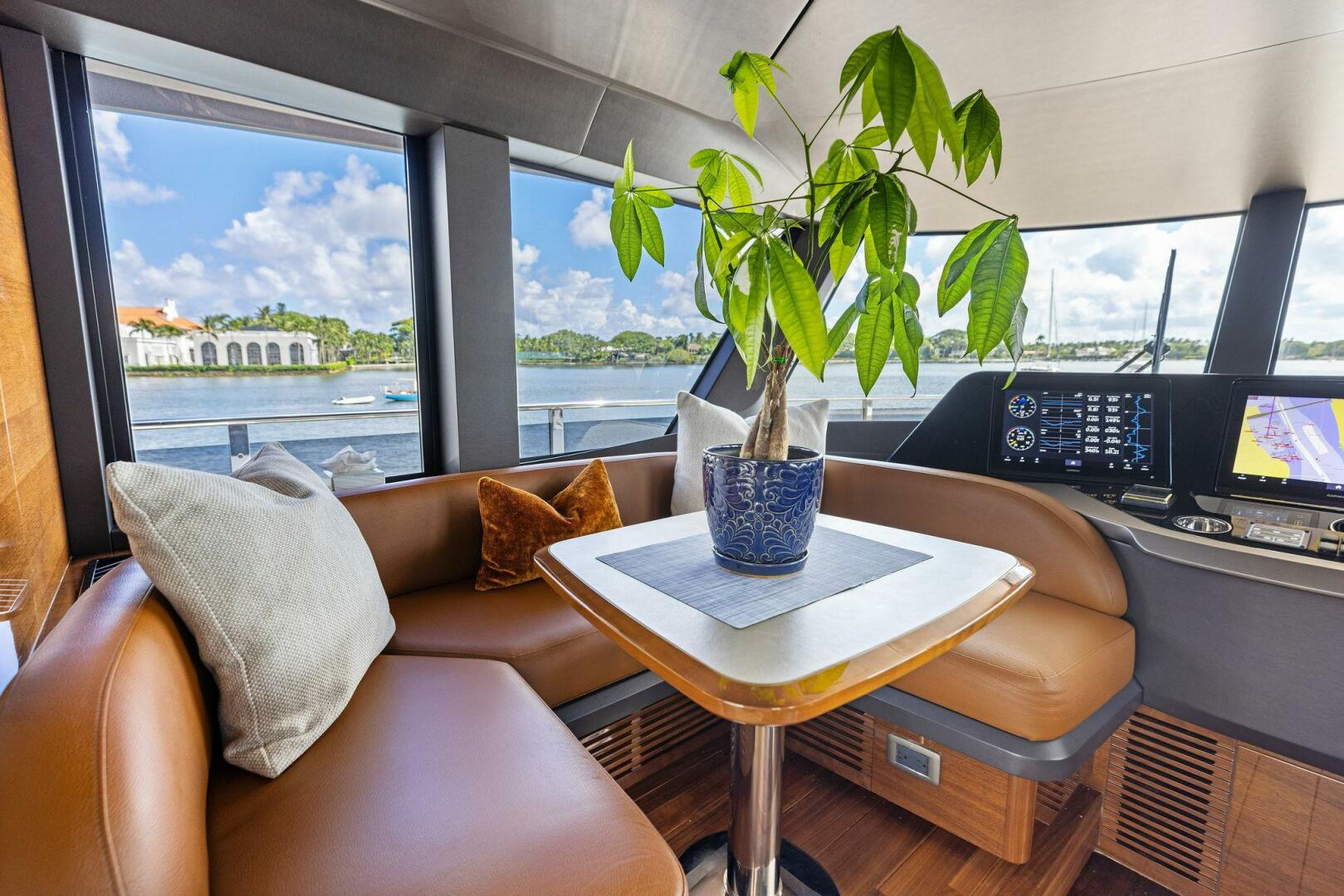 - Open-plan salon with large seating area aft