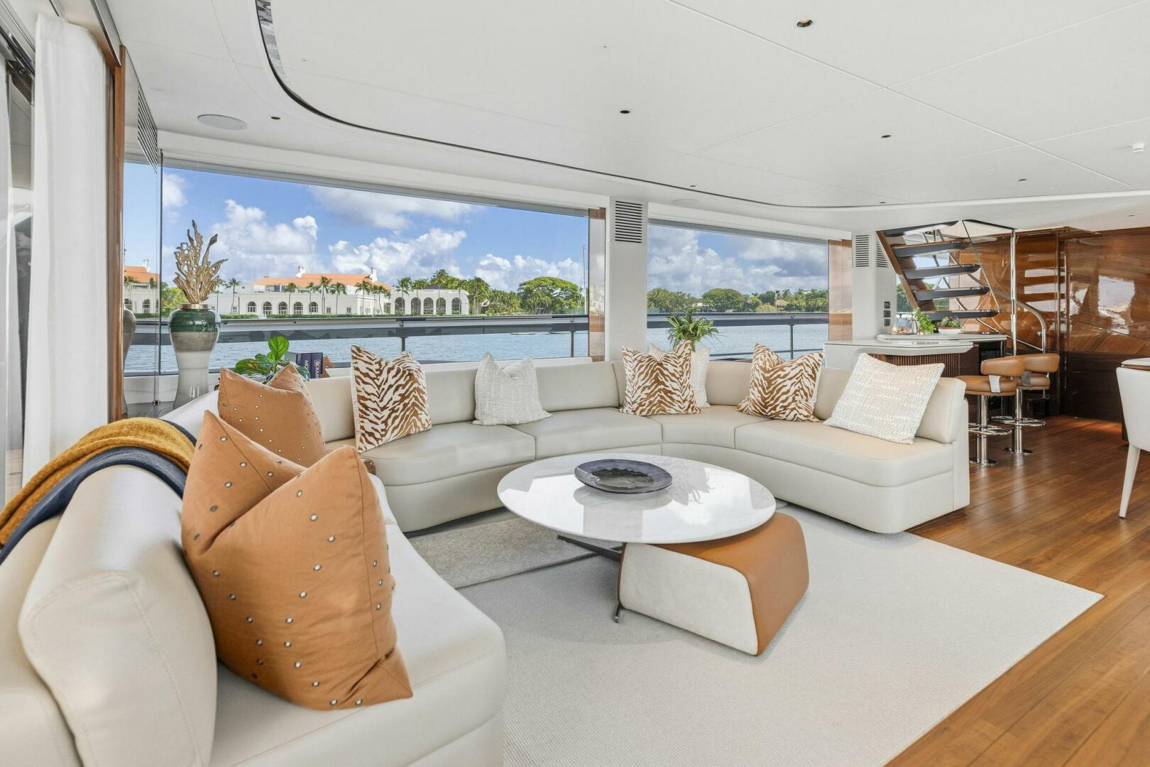 - Salon: circular sofa (port), 2-seater sofa (starboard), coffee table, bar with fridge, icemaker, sink, storage