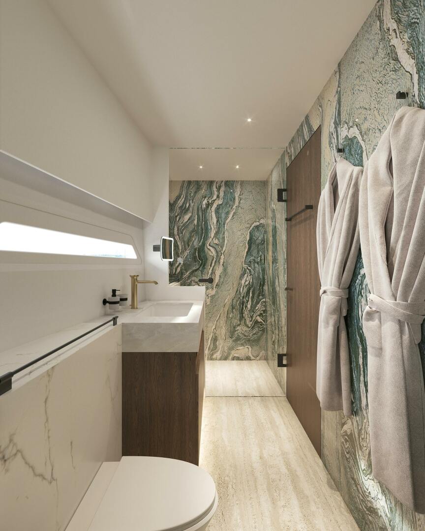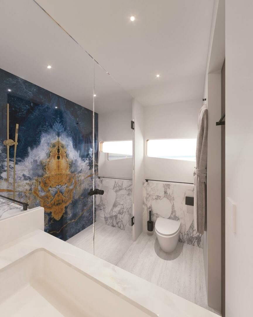 The interior of LANIAKEA is impressive, boasting a spacious, modern and open-plan layout on the main deck that seamlessly integrates a saloon, dining area, and galley. The yacht features a five-cabin configuration, including a master suite, two VIP staterooms and a further two additional cabins offering luxurious accommodations for up to 10 guests.