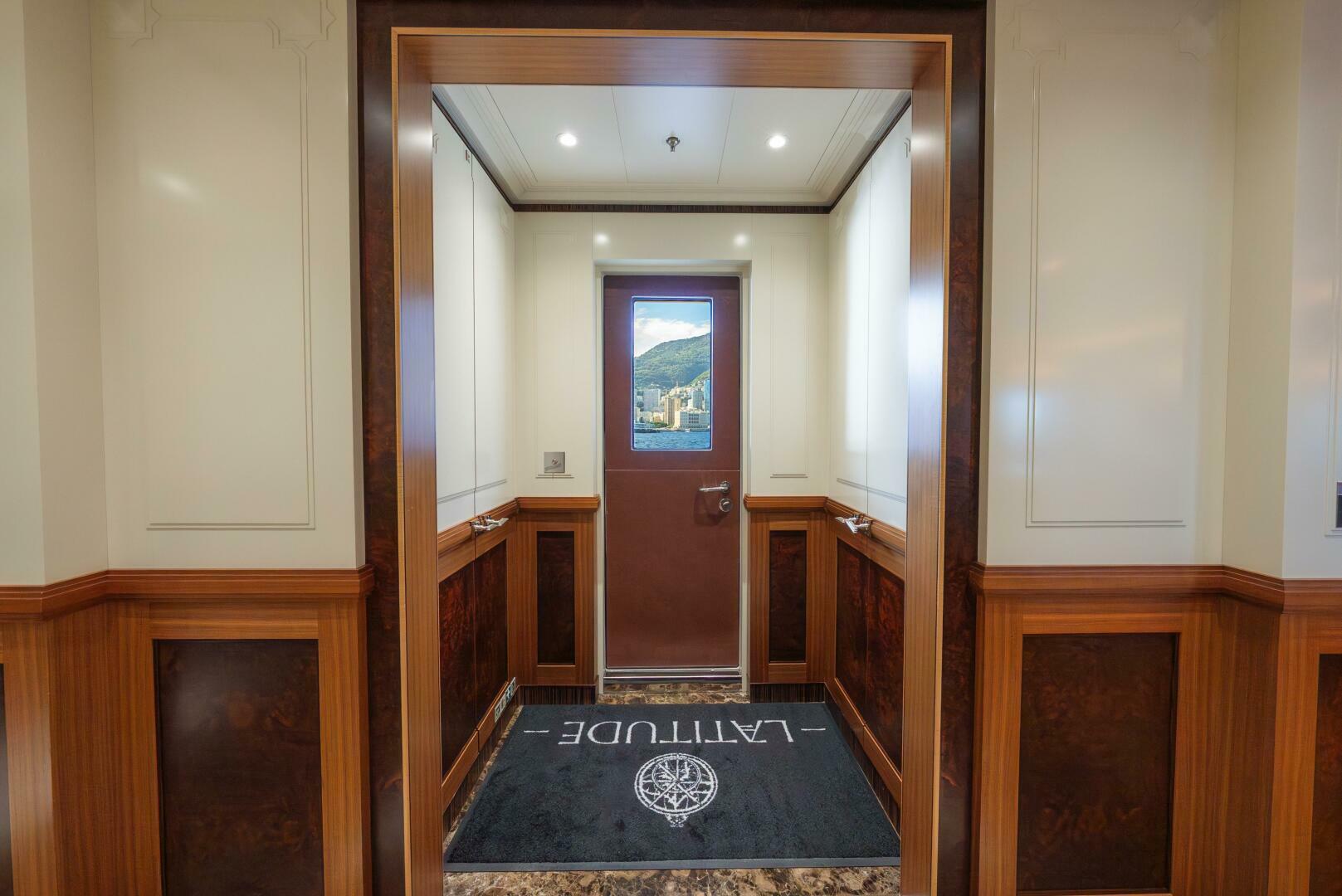 This central hub connects the pilothouse, the video-editing room, the stewardess pantry, the sky lounge, and a day head—proving once again that on LATITUDE, even transitional spaces are treated with the same attention to beauty, utility, and craftsmanship as the primary guest areas.