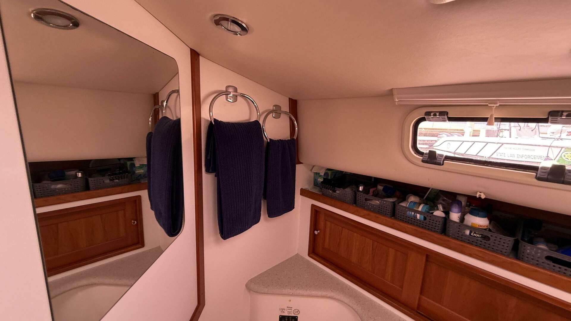 The head is located to port with dual entry from the salon or forward cabin. Vacuflush toilet, Corian counters with polished oval sink and mixer spigot. Cherry storage locker outboard with sliding doors and towel storage shelf above. Opening port and overhead hatch for ventilation.
