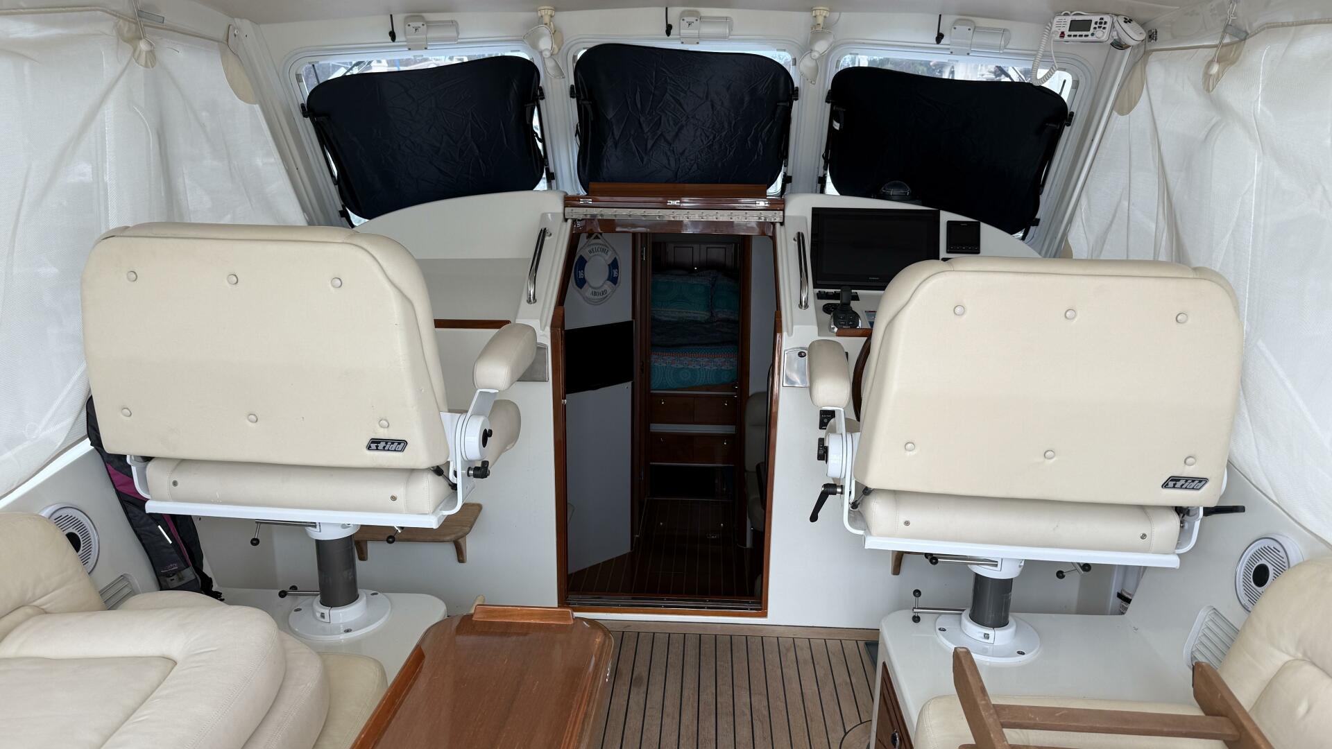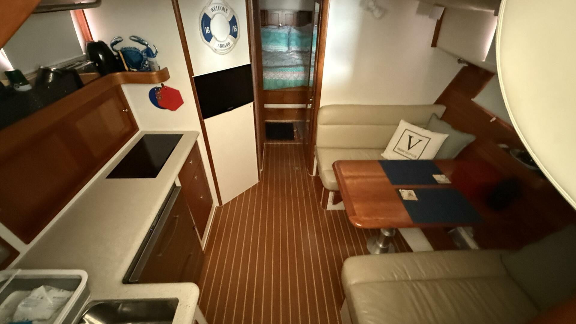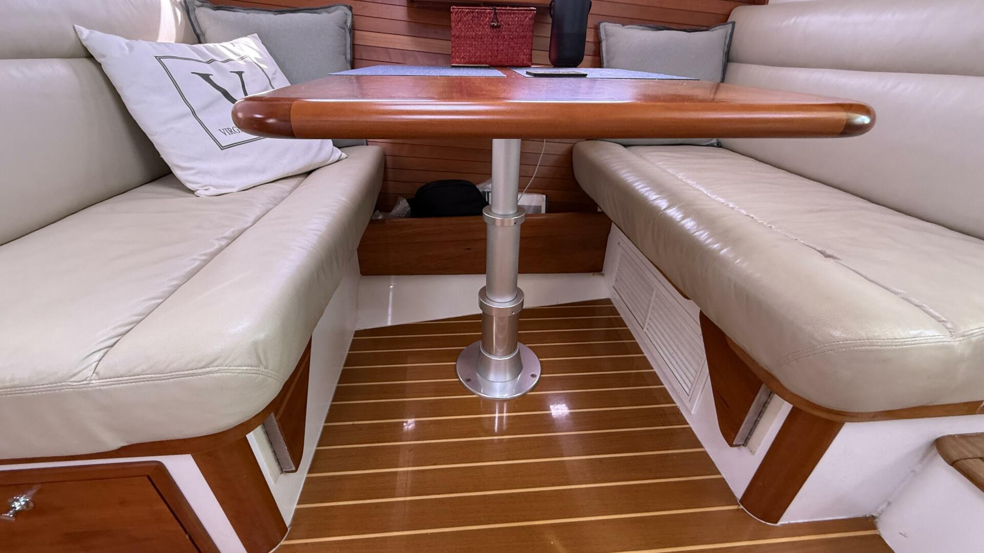 The salon has a dinette across from the galley with two athwartship settees and a cherry table that drops with an electronic control to make a 78" berth. An opaque linen curtain anchors to the ceiling to make this a private sleeping area; Large opening ports; Flat screen LED TV is mounted on angled bulkhead facing settee. Off-white Nevamar paneling with satin varnished cherry cabinetry doors and trim. Cabin sole is varnished teak and holly.