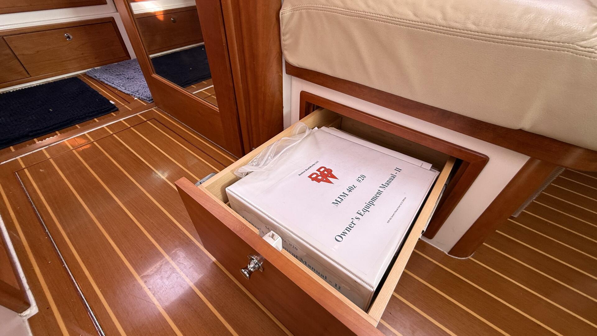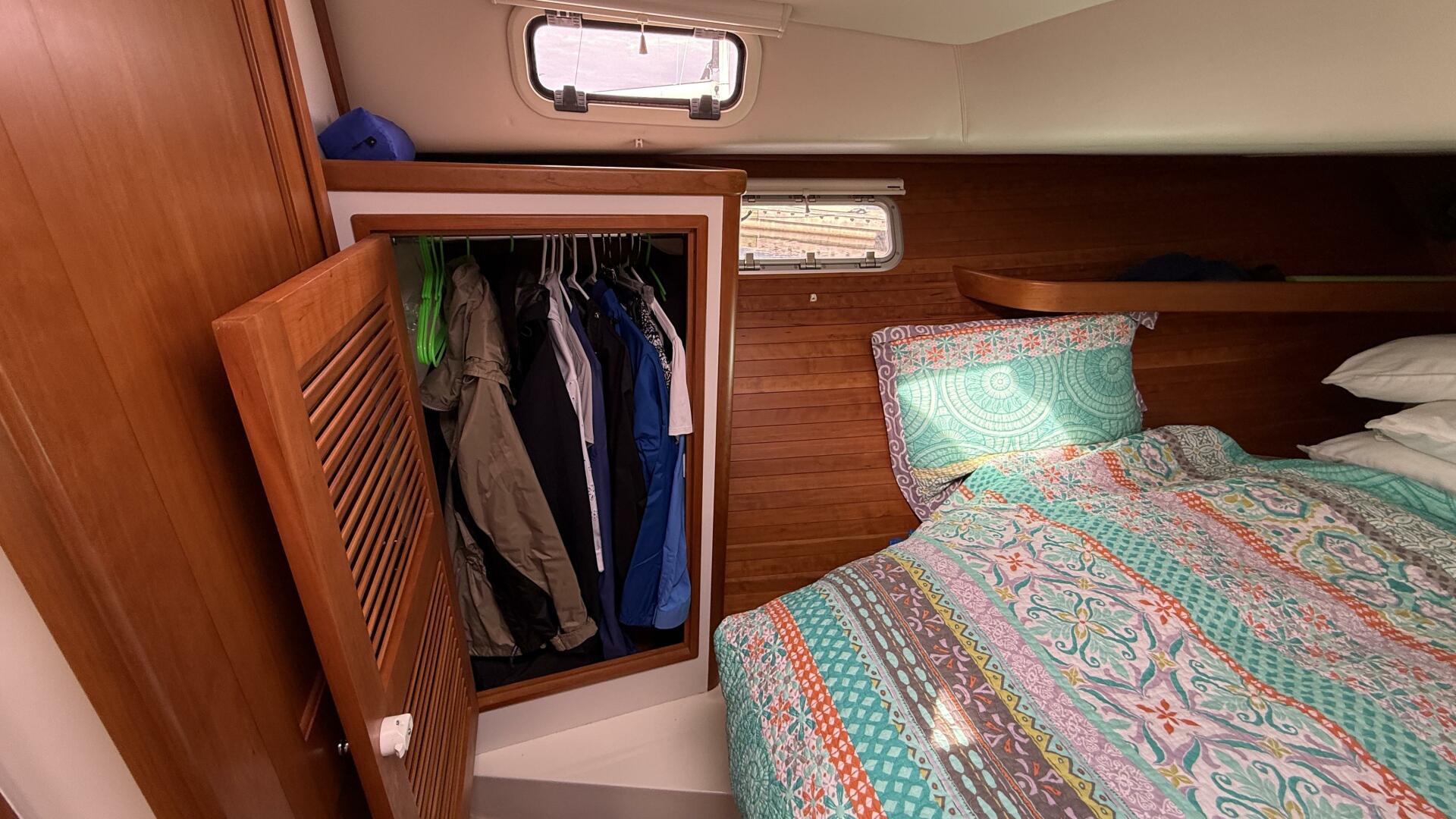 The owners' stateroom is forward and features a large (60" x 78") island berth with side access. There are four drawers at the end of the berth and a large storage area underneath. A hanging locker is to port. Book shelves and reading lights are at the head of the berth. Two overhead hatches provide star-gazing and ventilation. Hatches and ports all have ocean air, retractable shades, and screens. Access to the head and separate stall shower is from this stateroom. The queen berth has a latex mattress with custom fitted sheets, designer bedspread, pillows and towels.