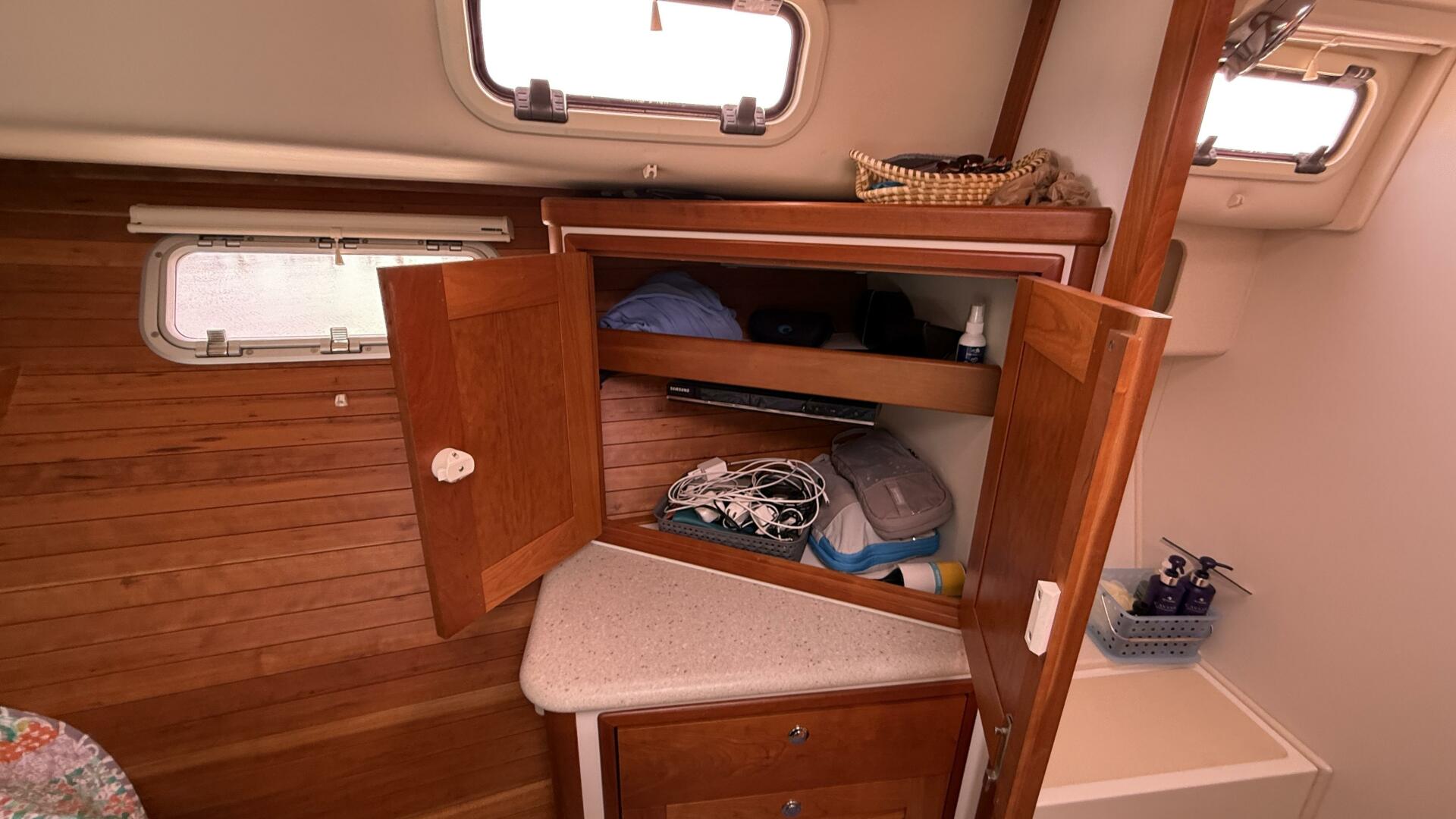 The galley is opposite the dinette with Corian counters, cherry paneled cabinetry, and push button hardware. Plenty of storage in lockers and drawers. Stainless Isotherm 5.5 cubic foot two-drawer refrigerator/freezer. Ceramic two-burner electric stove with pop-up retainers; Convection/ microwave oven.