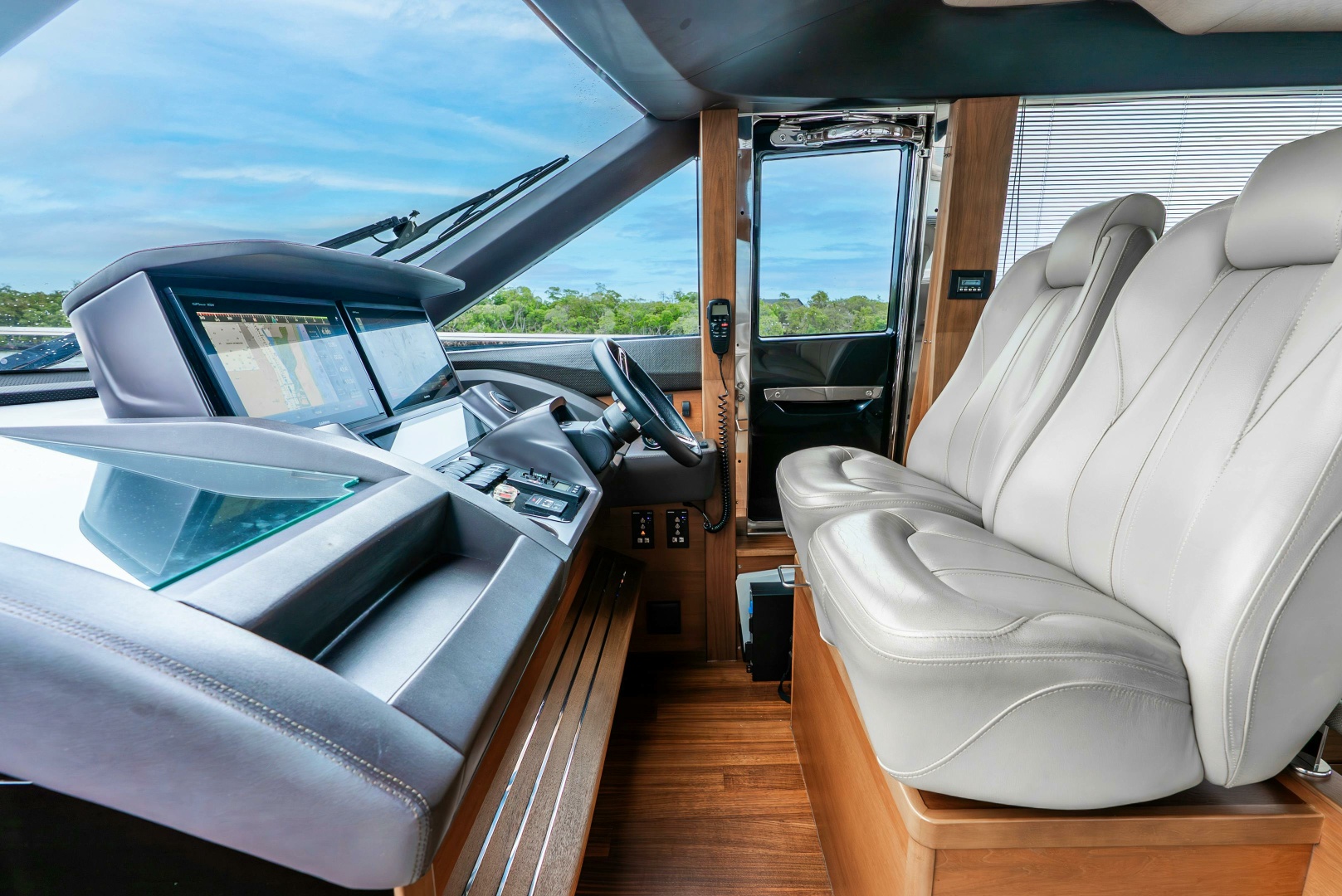 The lower helm station on the Princess 68 is designed with both functionality and social comfort in mind. To port, a raised L-shaped seating area allows guests to enjoy the journey alongside the captain, creating a more interactive and engaging cruising experience.