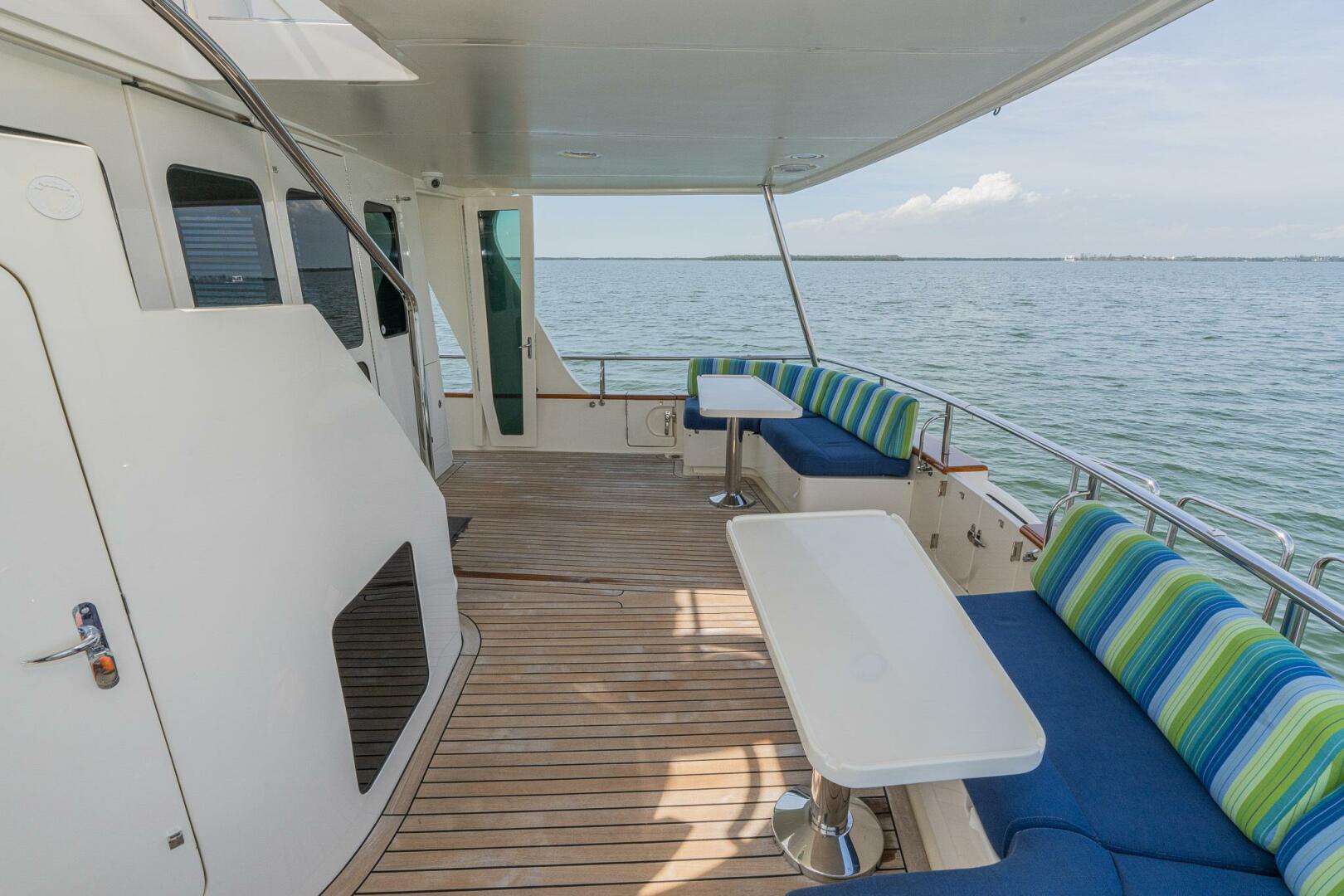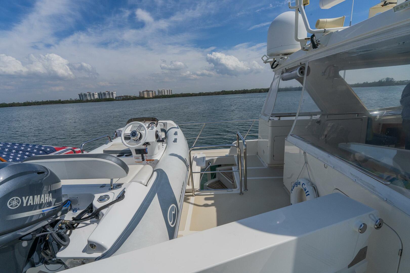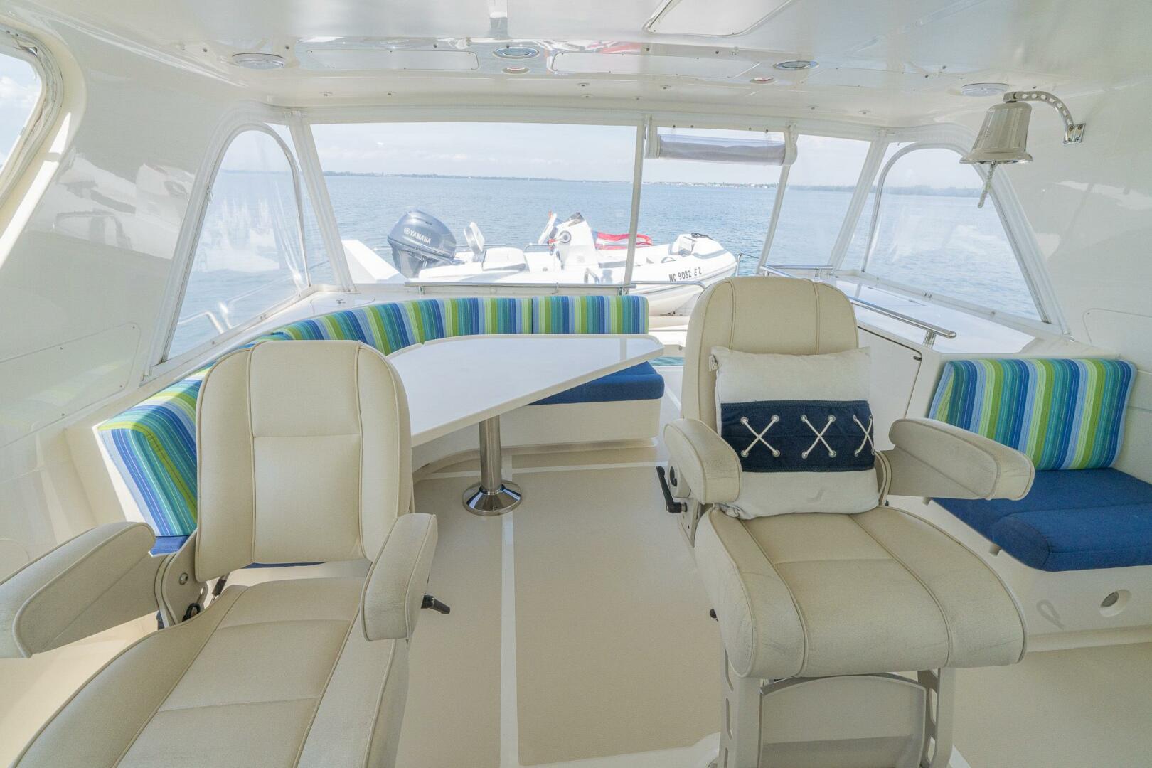 The Semi-enclosed Flybridge on “MARGIN CALL” provides a 360-degree view giving you great sight lines while navigating. Well-appointed with a Garmin electronics package including screens, Autopilot, Yacht Controller, VHF radios, and numerous other systems, she is a dream vessel for any captain. There are 2 STIDD captains’ chairs mounted at the helm with all navigational equipment at your fingertips.Large L-shaped seating area to starboard with table and grill, sink, refrigerator, and bench to port.