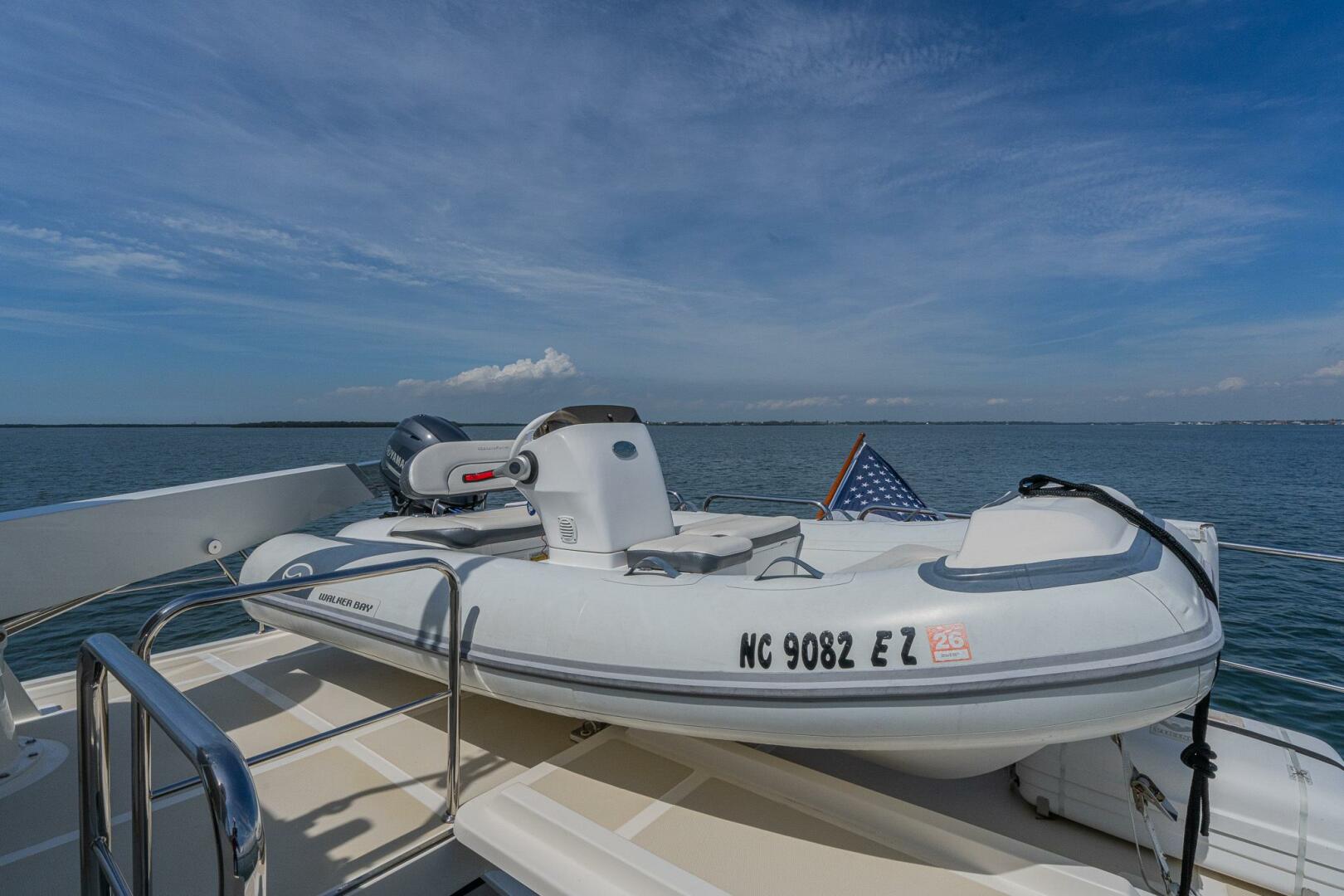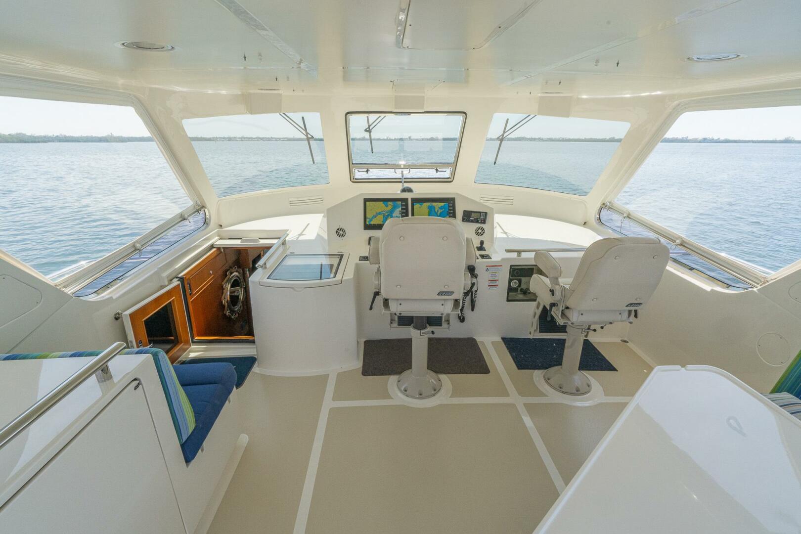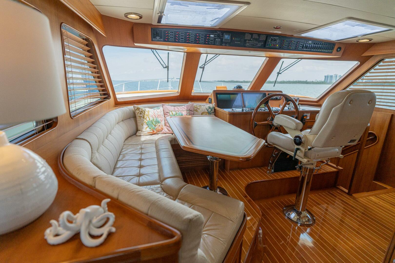 The Semi-enclosed Flybridge on “MARGIN CALL” provides a 360-degree view giving you great sight lines while navigating. Well-appointed with a Garmin electronics package including screens, Autopilot, Yacht Controller, VHF radios, and numerous other systems, she is a dream vessel for any captain. There are 2 STIDD captains’ chairs mounted at the helm with all navigational equipment at your fingertips.Large L-shaped seating area to starboard with table and grill, sink, refrigerator, and bench to port.