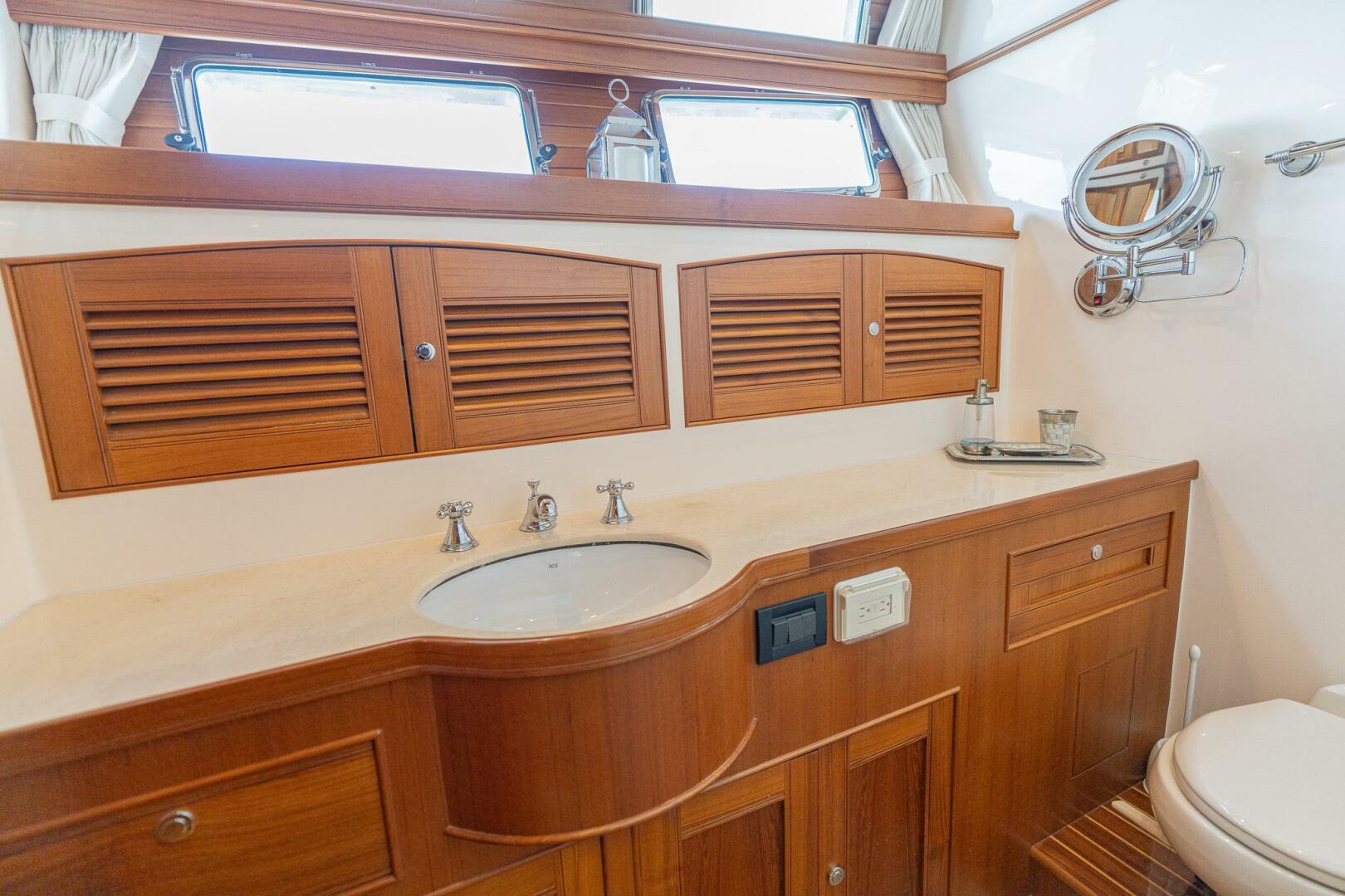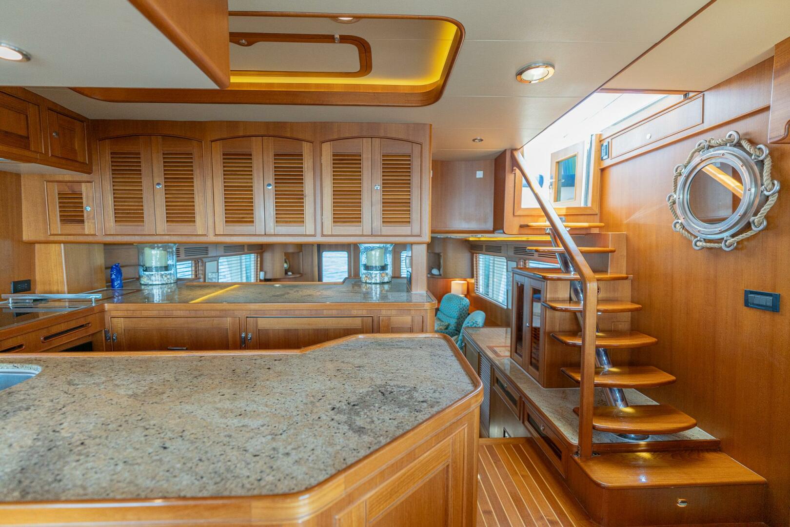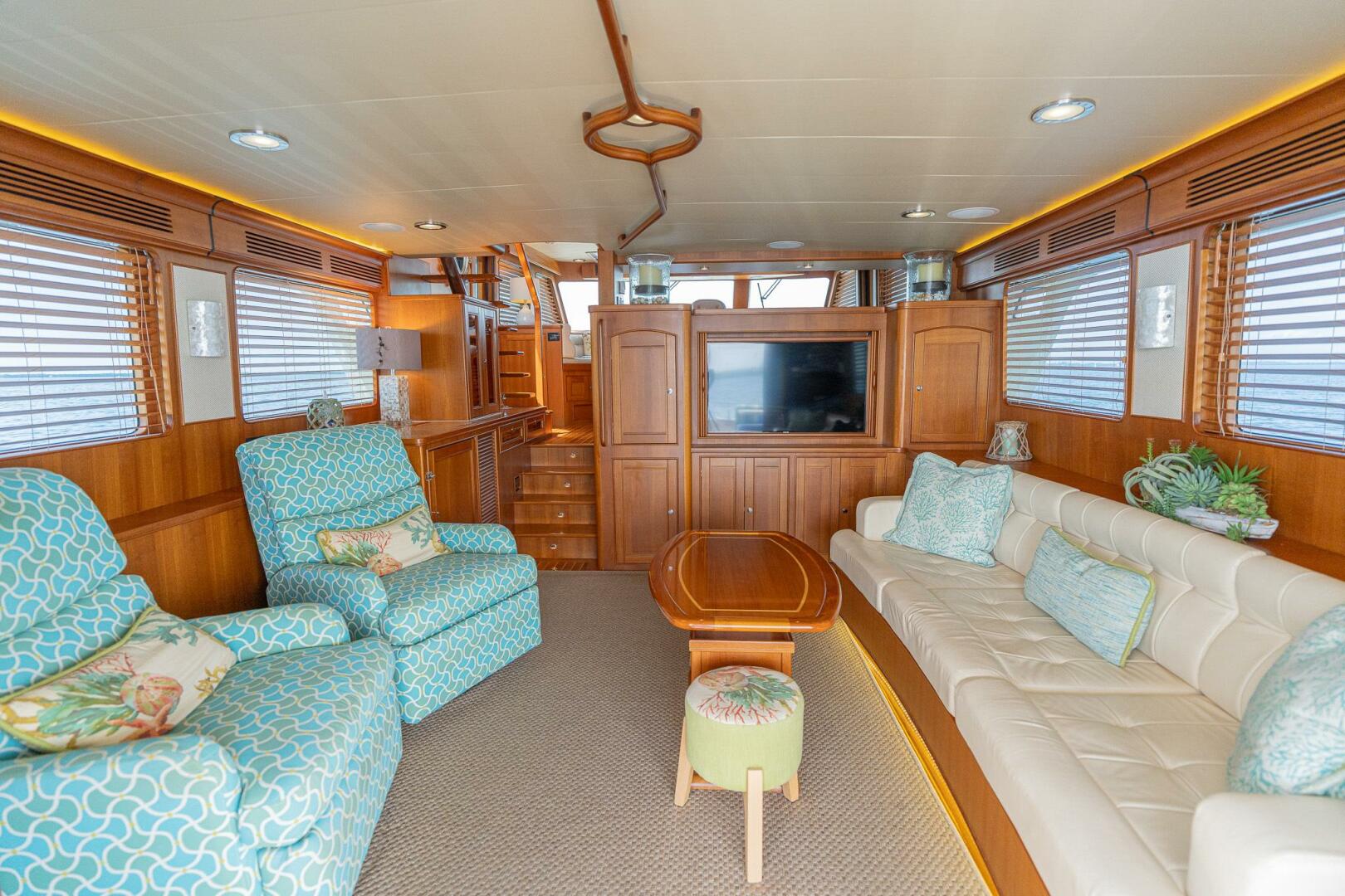 As you walk into the salon from the cockpit through a set of double doors, you can immediately appreciate her 18’6” beam which makes “MARGIN CALL” seem like a much larger yacht. The elegant teak and holly floor extends the length of the whole room and carries throughout the vessel. To port there are a couple of comfortable chairs with a wet bar area forward and a large granite countertop. To starboard, she was built with a large settee. The middle of the room is accented with a gorgeous custom-built high gloss teak table. The TV is located on the forward wall of the Salon allowing it to be viewed from the Salon and Cockpit.