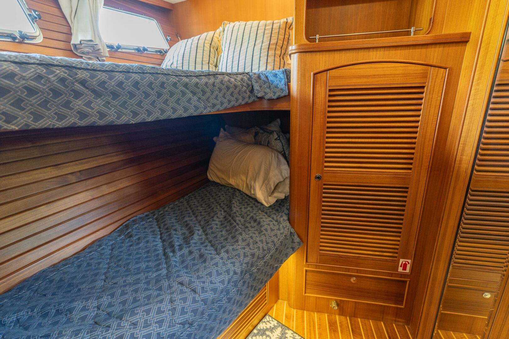 The port guest stateroom houses two bunks, drawers underneath the beds, hanging locker forward, and a desk with additional storage aft.