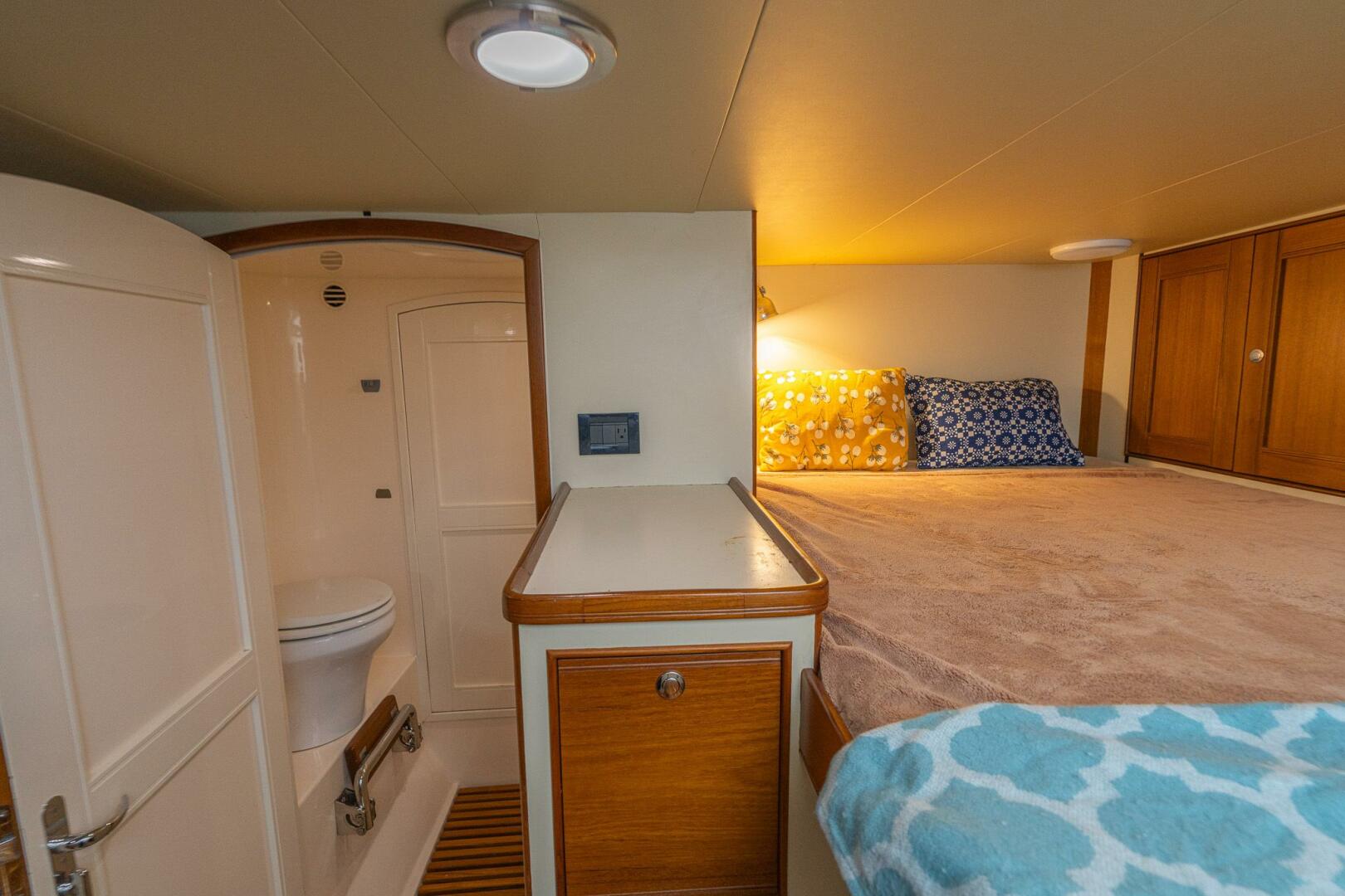 The VIP stateroom consists of a large elevated center-line berth with abundant storage underneath, above the bed to either side, and hanging lockers on either side. Above the bed on both sides, MARGIN CALL was built with additional shelves for added storage.