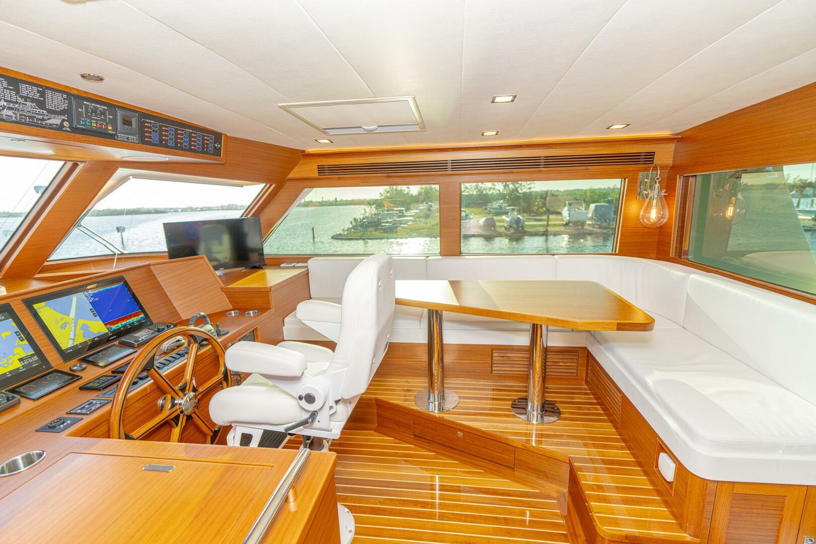 - Custom Command Bridge built with carbon fiber to reduce weight aloft. It includes a day head to port and a large seating area to starboard and aft.