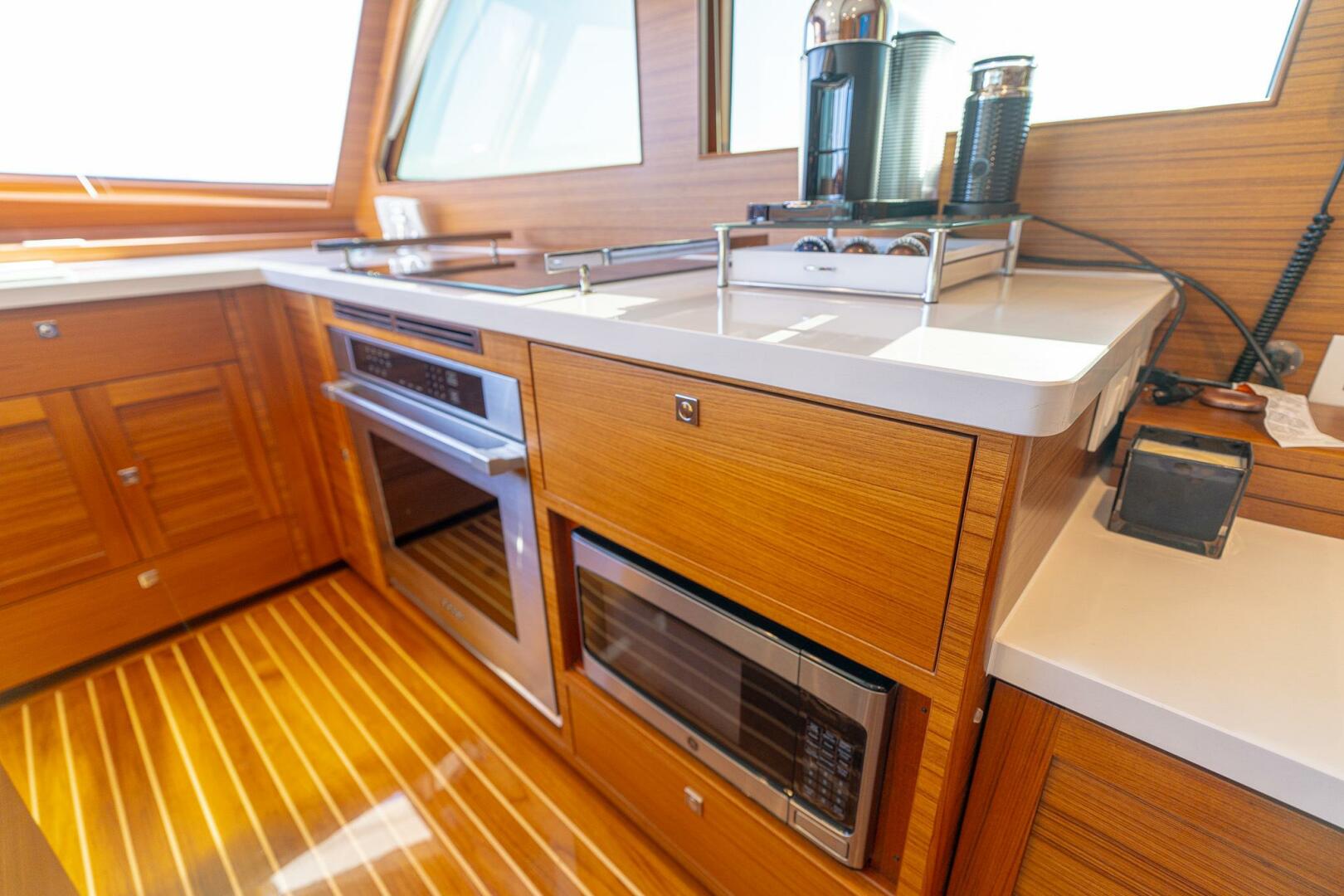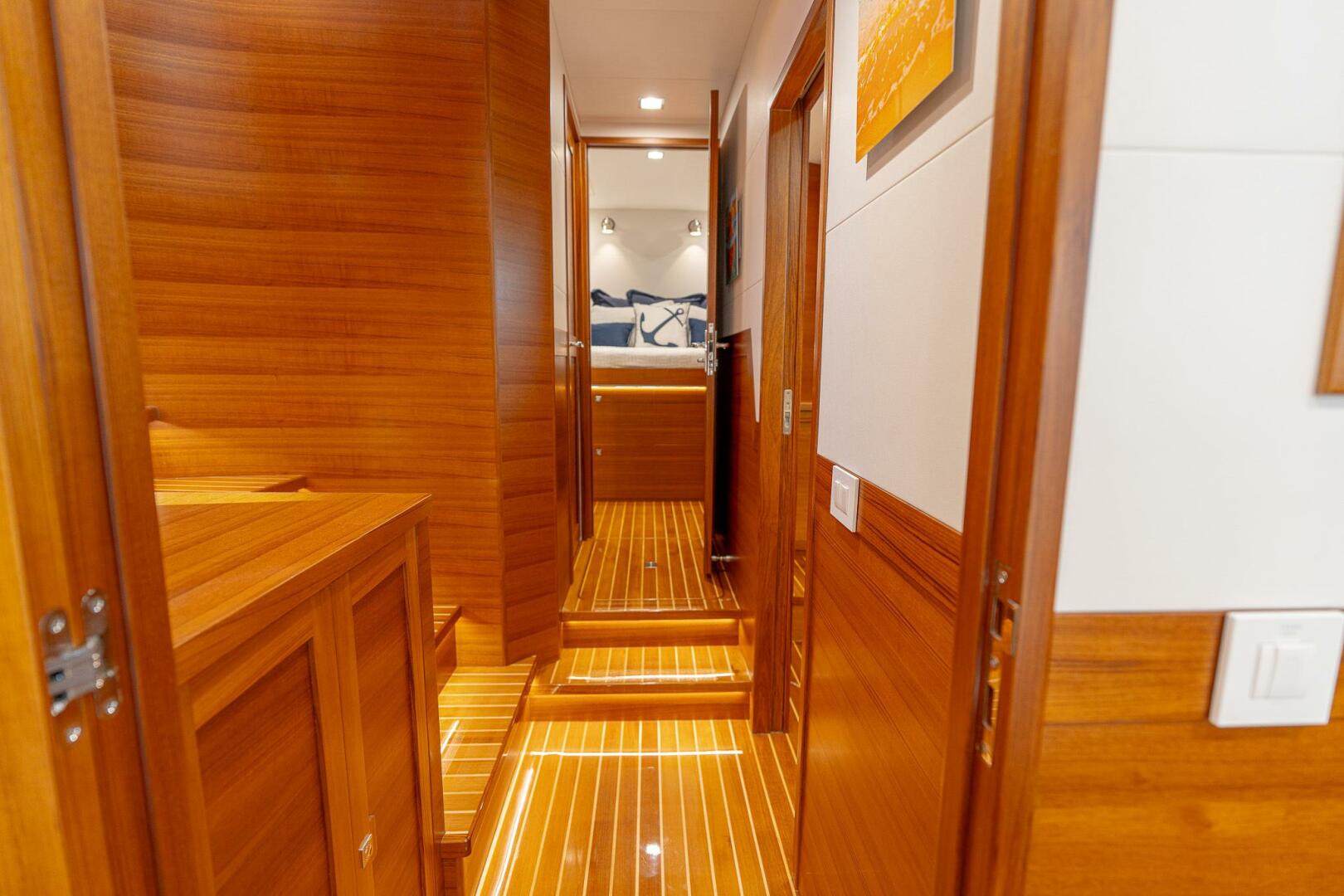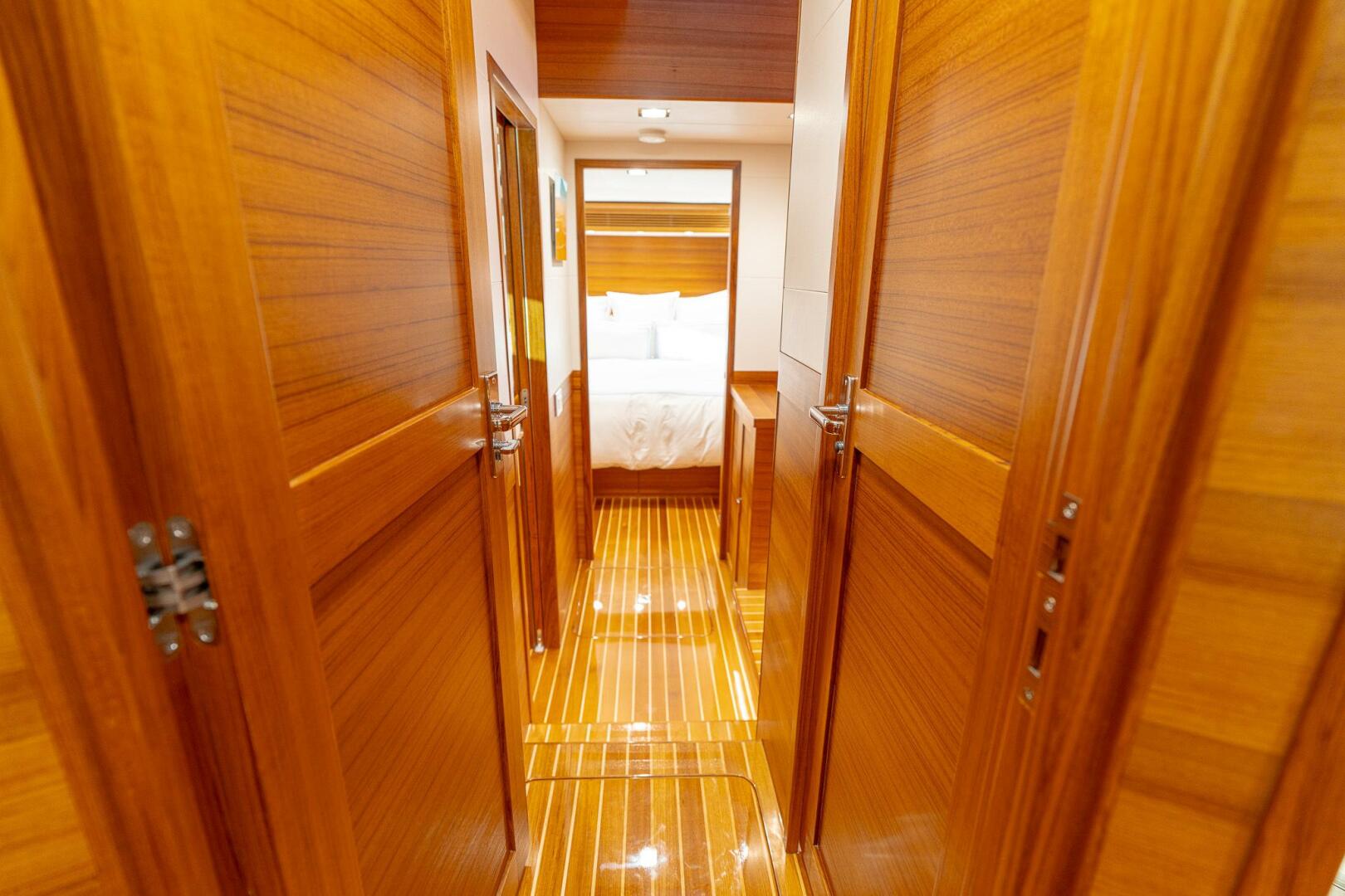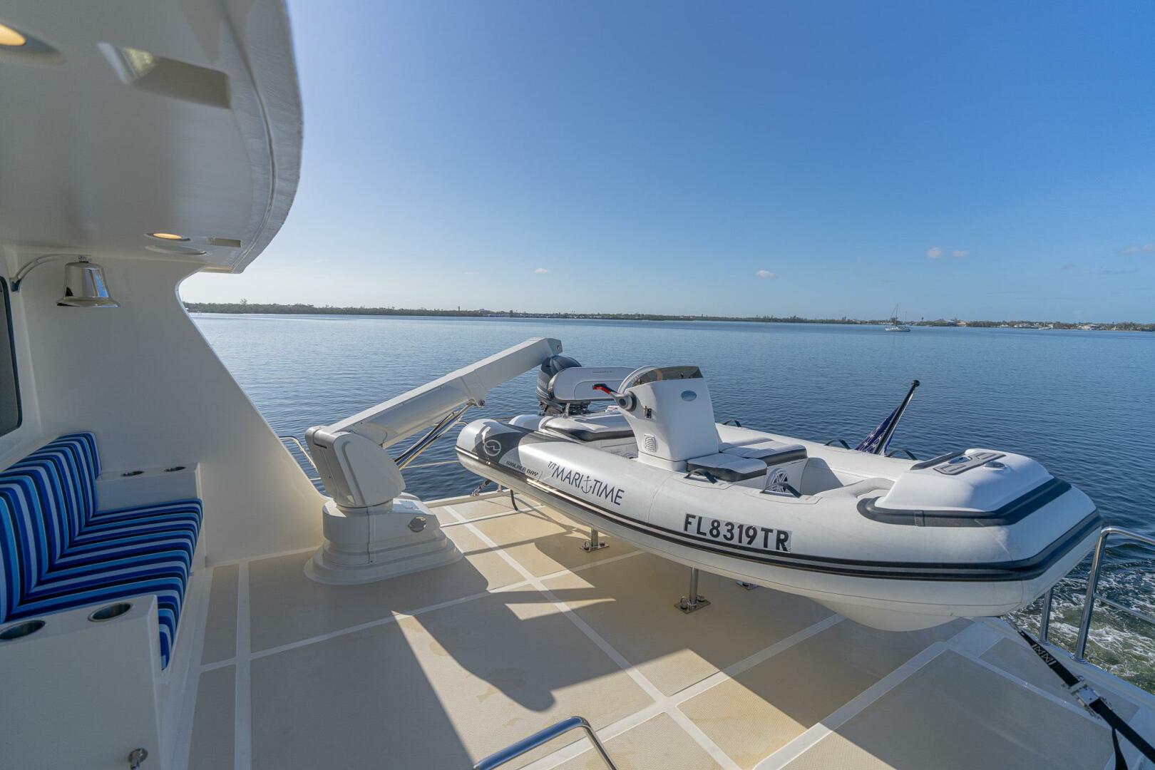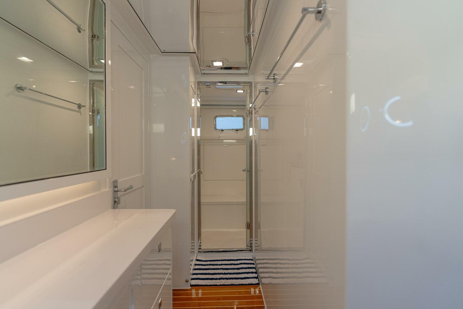 - Custom layout includes a pass-thru feature that allows access from the master stateroom into engine room and beach club through a utility area that houses the washer and dryer.