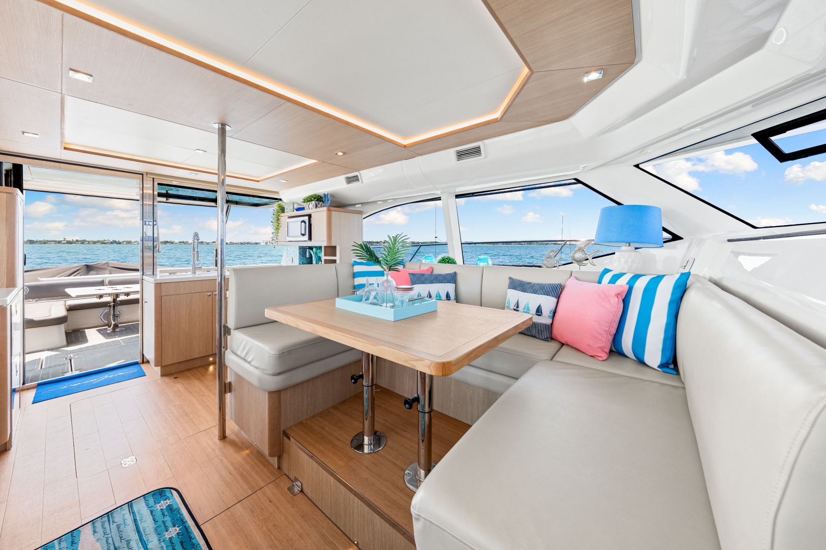 Excellent all round visibility from salon seating Shatter-proof windows with external overhangs offers excellent visibility and reduced sunlight Tempered glass, hinged door, and window access to cockpit offers excellent ventilation and through flow Four (4) opening port lights in forward salon windows provide excellent ventilation (not available with inside steering option) Custom blinds fitted on salon windows Overhead LED ceiling lights, LED mood lighting and LED courtesy lighting Panel ceilings with decorative wood trim and LED accent lighting Cabinets and counter top on starboard side Settee seating U-shape around salon table, six (6) seats Salon table which has ability to convert into comfortable single bed Large shelves behind settees Upholstered cushions Two (2) Fusion speakers Vertical 316L stainless-steel handrail in salon Synthetic wear resistant flooring offering maintenance free natural wood loo.