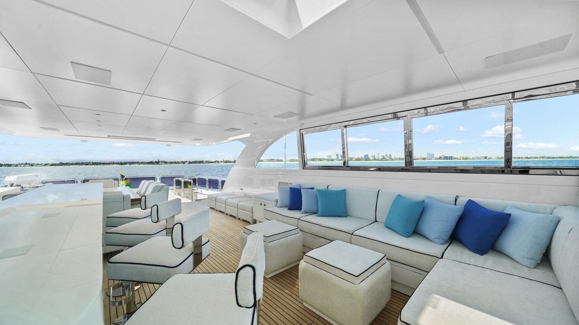 From first glance, MISS MICHELLE commands attention. Her contemporary lines and expansive profile convey elegance and power. The aft deck welcomes guests with a U-shaped sofa surrounding a teak coffee table in a striking starburst design. A 43" fold-up LED TV and a subwoofer offer the perfect setting for gatherings, while a Hi/Lo coffee machine is neatly concealed to starboard for added convenience.