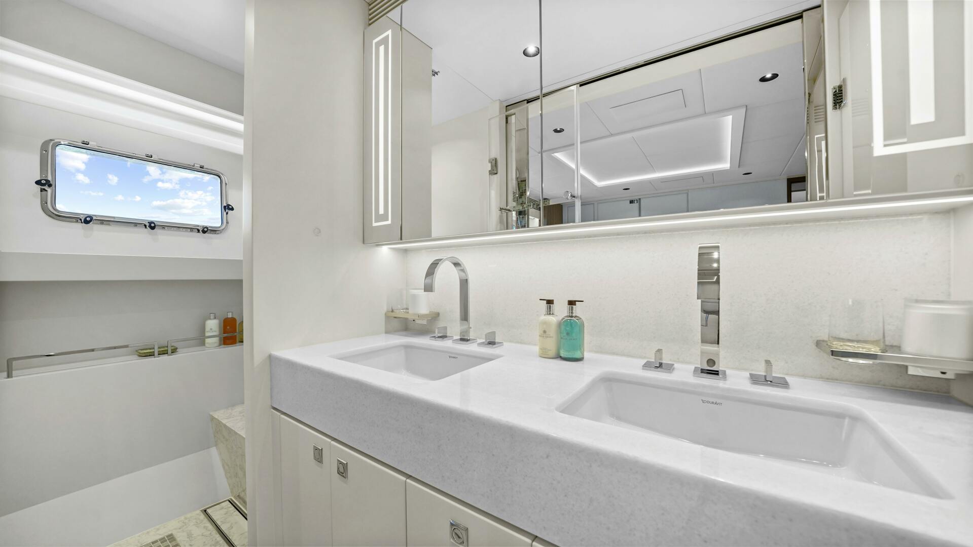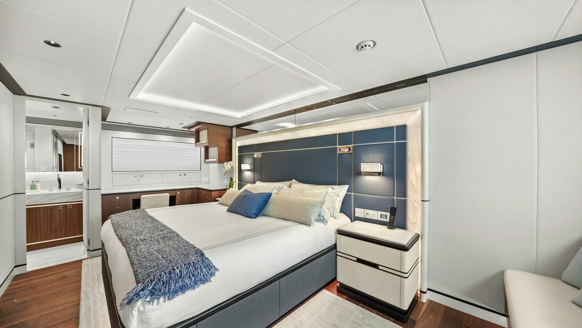 The main deck features a full-beam master suite designed for absolute privacy and comfort. A king-sized bed is framed by Corian White Onyx stone, and the space includes walk-in closets, a vanity, and a beautifully tiled ensuite bathroom with dual sinks. A mirrored ceiling detail adds dimension and height, while integrated wireless charging stations and a Hi/Lo coffee machine offer modern convenience within this tranquil retreat.