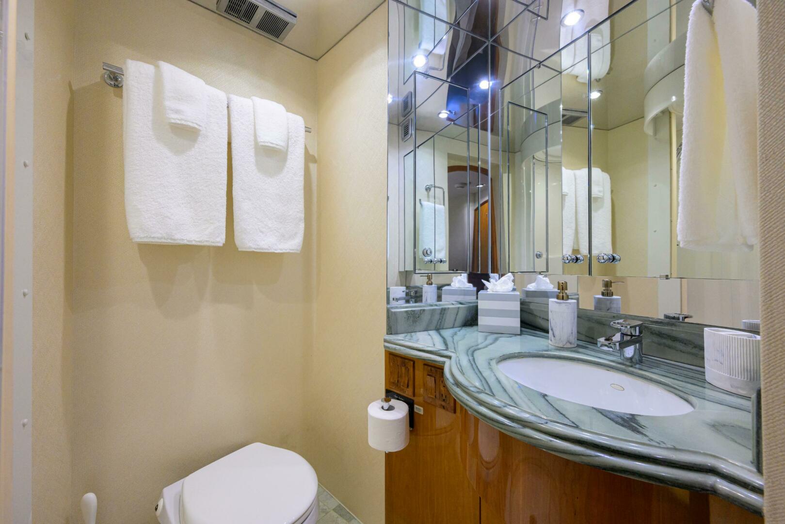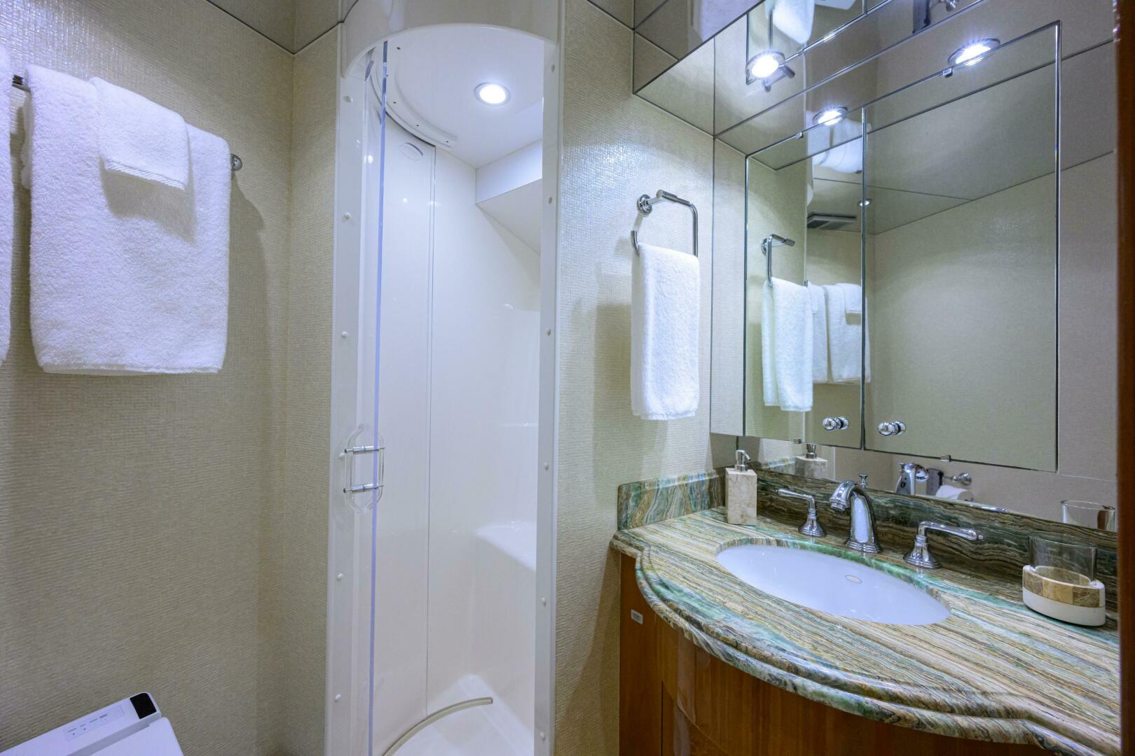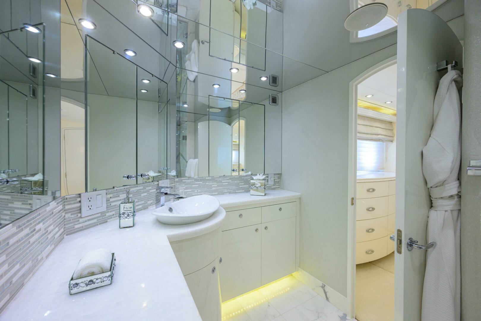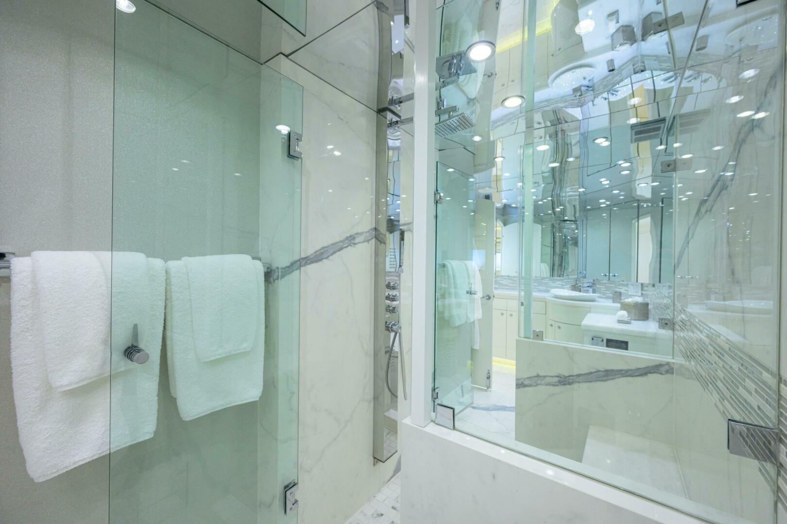 The His & Her Master Bath offers custom lacquered vanities with Mystic White marble surfaces and a bespoke tile backsplash, alongside a built-in makeup vanity with drawer and stool. Both spaces feature ceramic sinks with polished stainless hardware and are finished with mirrored forward bulkheads, medicine cabinets, and overhead storage. The centerpiece is a centerline marble shower with frameless glass enclosure and marble bench, complemented by custom porcelain flooring and polished stainless fixtures throughout. The space is further enriched with custom wallcoverings and upgraded Toto heads, port and starboard.