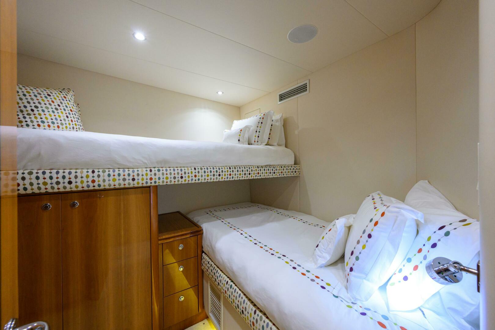 The Twin Guest Stateroom, Starboard offers upper and lower twin berths with storage beneath the lower bunk, paired with an upholstered bed base for comfort and style. The space is finished with Whisper wall bulkheads and headliner, along with new carpeting and soundproofing. Storage is provided by built-in cabinets with drawers and a cedar-lined hanging locker with auto-light, while a full-length mirror adds both functionality and elegance. Entertainment is provided by a Samsung 25” TV mounted on the bulkhead with Blu-ray/CD and RF iPad remote. Comfort is further enhanced by a new air handler with updated ducting and insulation.