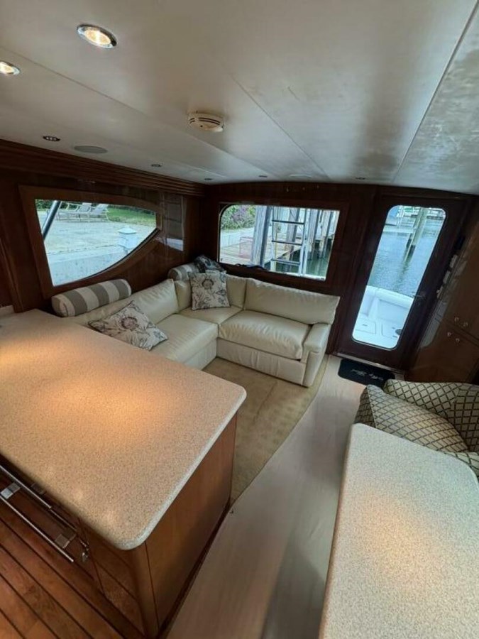 The salon is accessed through the port and starboard doors amidship going aft is a full dining table forward in the salon. She is tastefully done with cherry woodwork throughout with crown molding and updated (salon) arrangement. Custom cabinetry was added with all new soft goods.