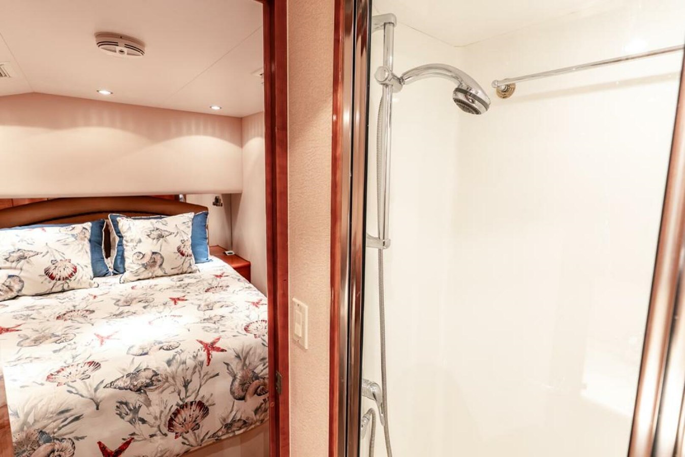 The accommodations on MY GIRL offer the best layout that is featured on a boat its size or bigger. The master stateroom is Amidship and full beam with a full-beam head. The master stateroom offers a California king size bed. Just aft of the master stateroom are the 3rd & 4th guest staterooms, one queen and the other twins both with ensuite heads are just aft for the master stateroom separated by a large foyer.