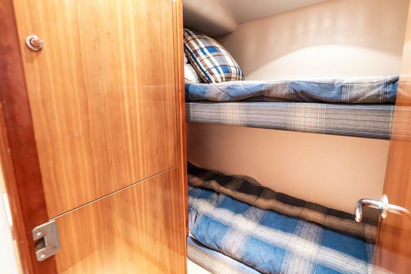 To port is a full captain berth with private head and shower. The captain’s cabin has been upgraded with cabinetry and drawers and gas shocks to bed. To starboard are staggered (over/under) single berths with private head and shower. The berths have been rearranged to fit larger berths and cabinets.
