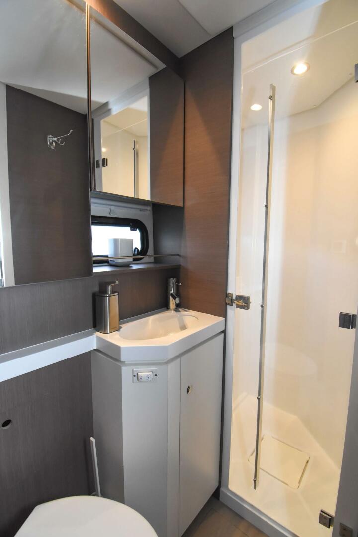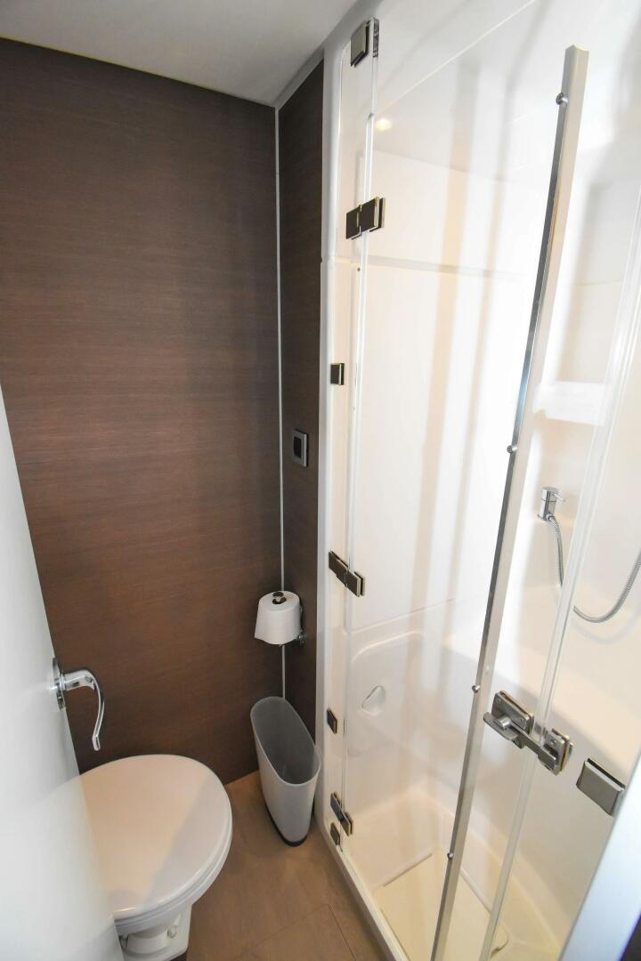 Berth in starboard forepeak (berth, porthole, cupboard, washbowl, shower, and head)