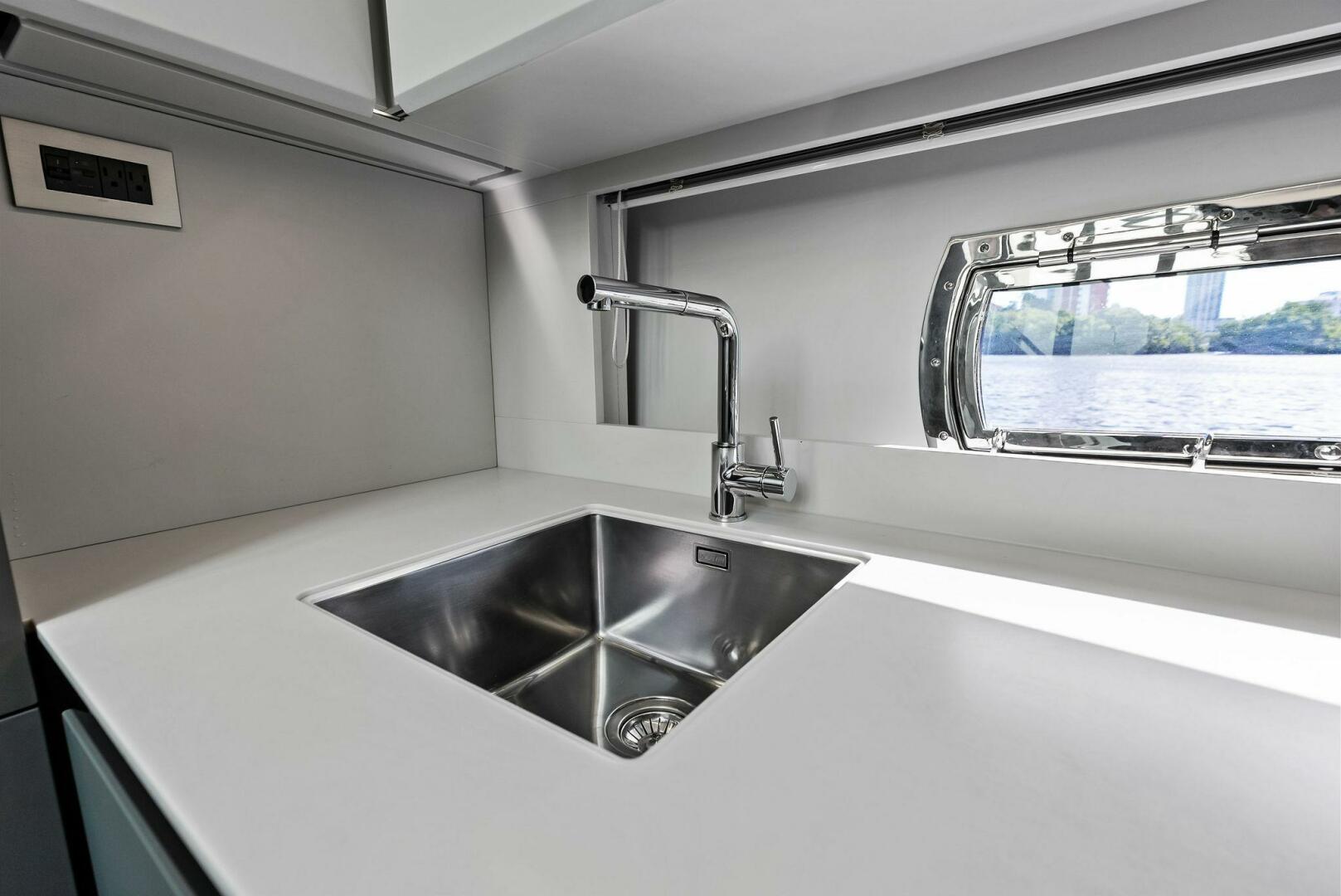 - Port side cockpit cabinet in fiberglass with sink and fresh water