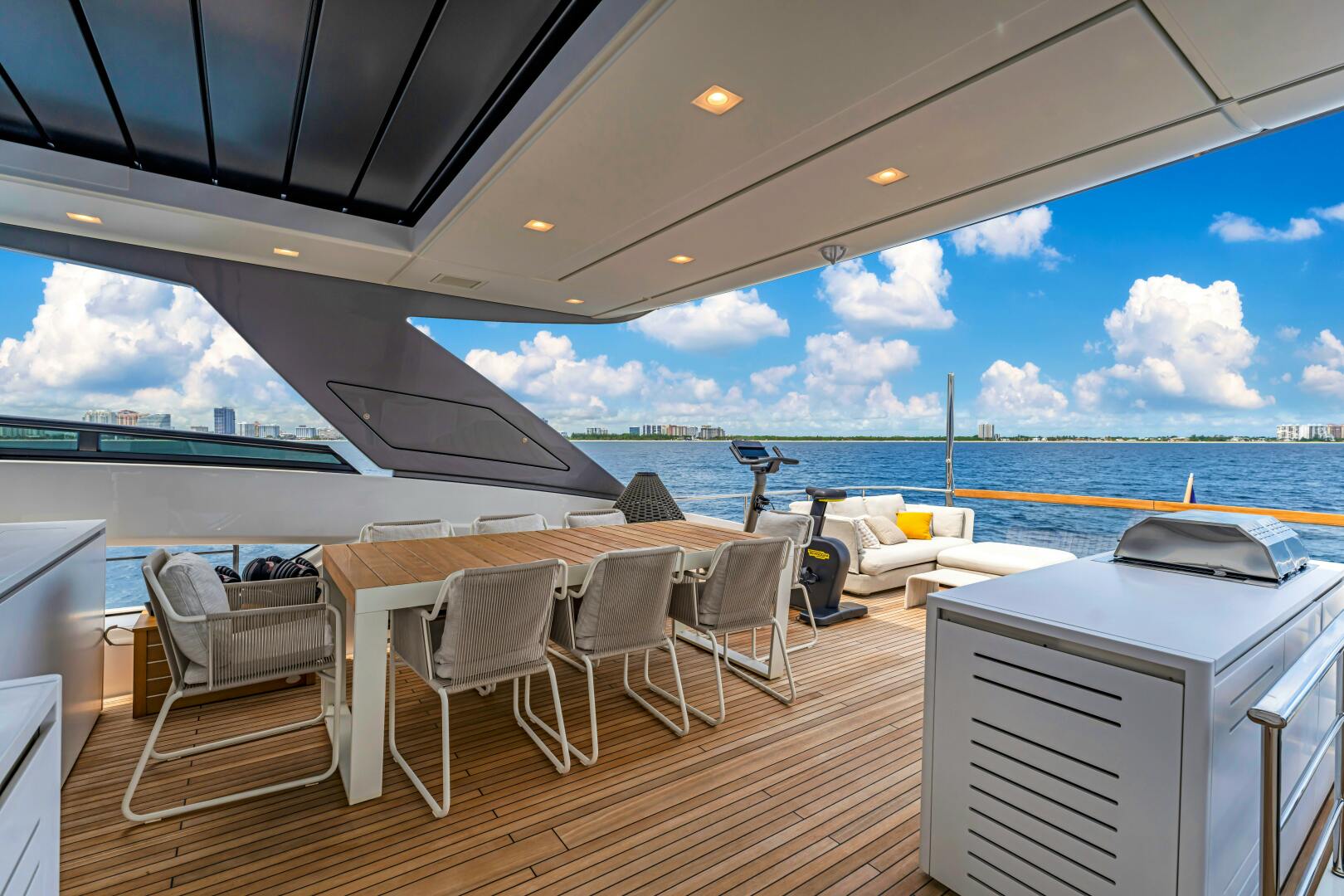 Stepping aboard NOTYNOG through the starboard-side boarding gate, you are welcomed onto the covered main aft deck—an elegantly designed space perfect for relaxation and entertainment. A built-in seating area invites guests to unwind, complemented by two electric up/down tables and five loose chairs for flexible dining arrangements, whether for intimate gatherings or larger social events. Additional boarding access is available via a port-side gate, while a portside pasarelle extends for easy boarding when docked stern-to.