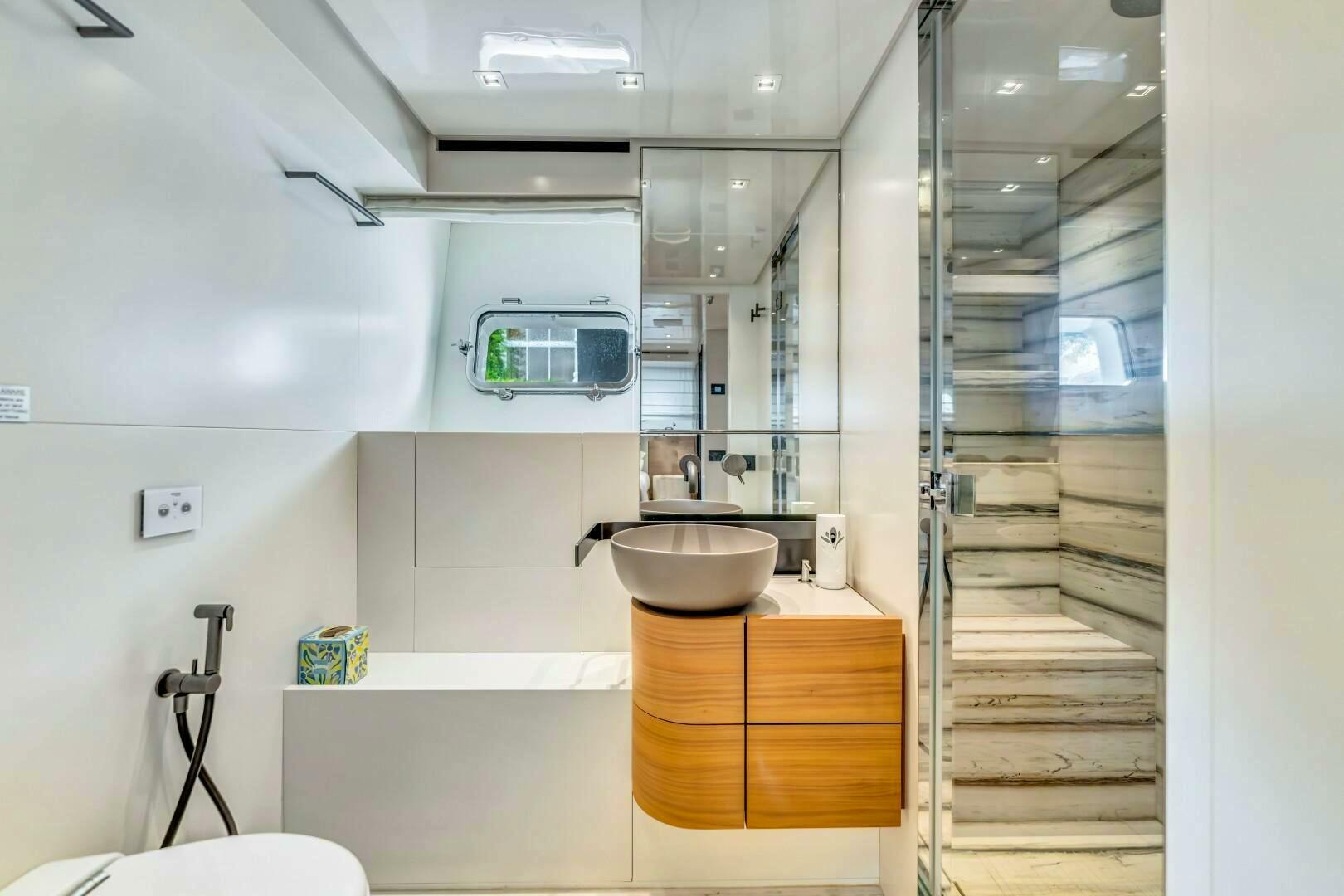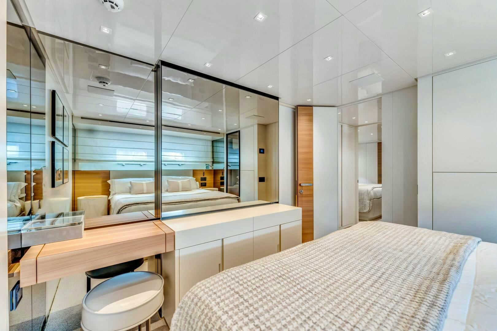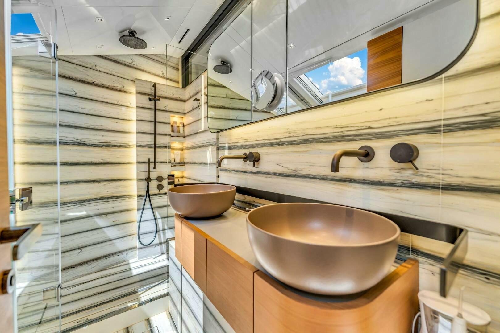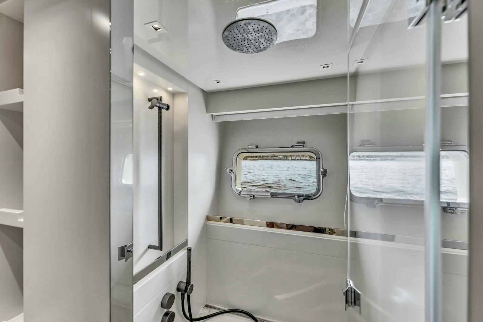 Moving forward on the port side, you pass a striking open-glass staircase leading to the lower cabins. A pocket privacy door separates the main salon from the dayhead and master suite. The full-beam master retreat is designed for ultimate comfort, featuring a king-size bed to starboard, a built-in desk to port, and a hidden television elegantly concealed behind a mirrored panel. Expansive windows on both sides offer breathtaking views, while an electric door provides direct access to the starboard-side main deck. The luxurious en-suite, accessed down a single step to port, boasts dual sinks, a glass-enclosed shower with marble finishes, and a skylight that bathes the space in natural light. Beyond the en-suite, two additional steps lead to an expansive walk-in closet with ample hanging storage.