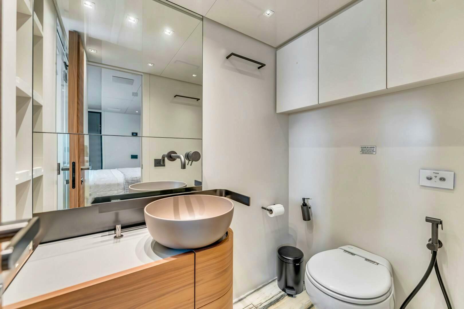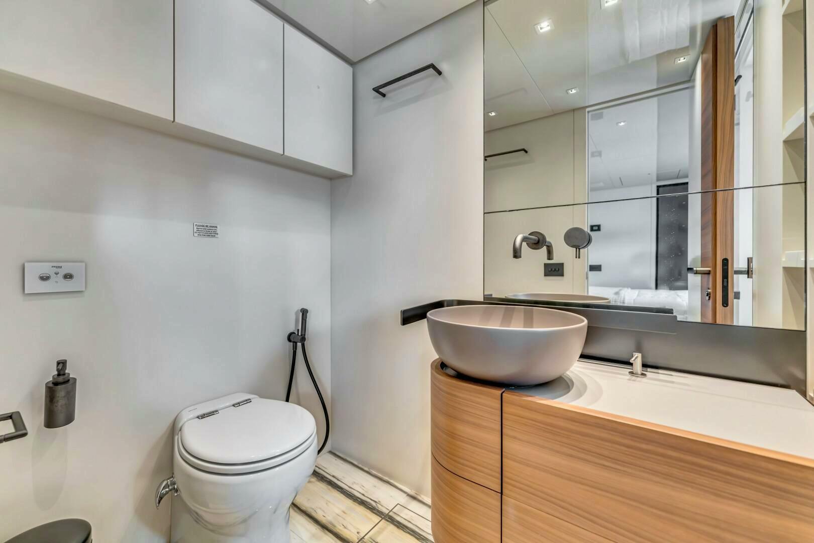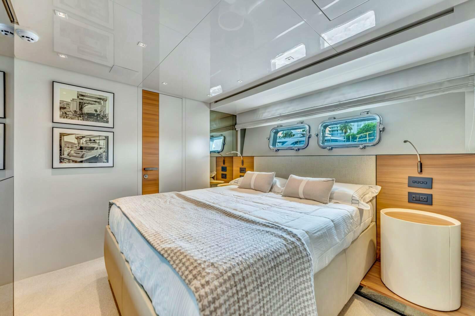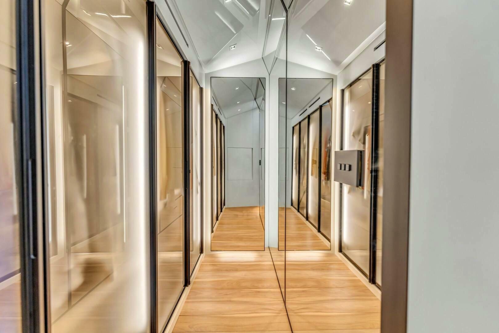 Moving forward on the port side, you pass a striking open-glass staircase leading to the lower cabins. A pocket privacy door separates the main salon from the dayhead and master suite. The full-beam master retreat is designed for ultimate comfort, featuring a king-size bed to starboard, a built-in desk to port, and a hidden television elegantly concealed behind a mirrored panel. Expansive windows on both sides offer breathtaking views, while an electric door provides direct access to the starboard-side main deck. The luxurious en-suite, accessed down a single step to port, boasts dual sinks, a glass-enclosed shower with marble finishes, and a skylight that bathes the space in natural light. Beyond the en-suite, two additional steps lead to an expansive walk-in closet with ample hanging storage.
