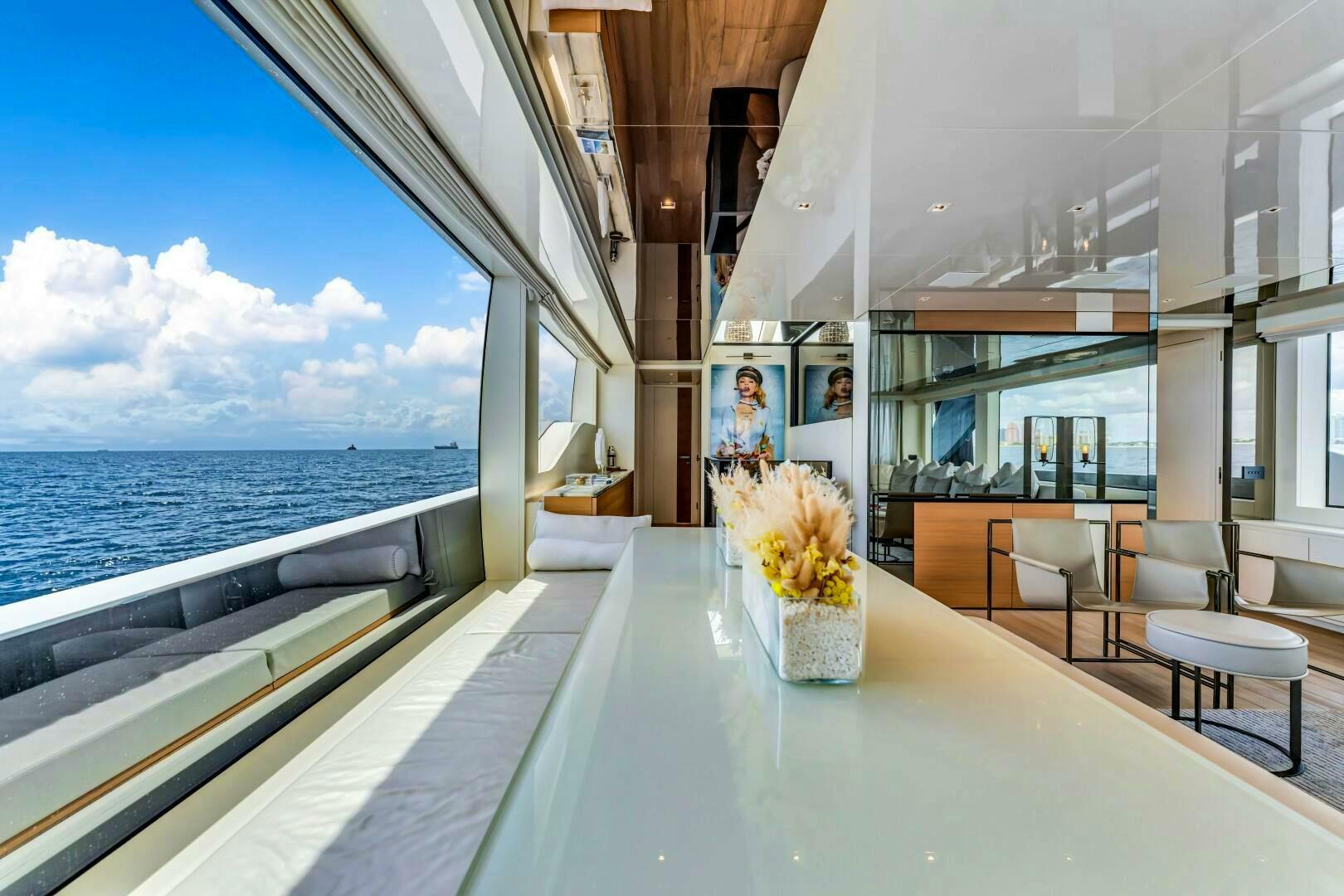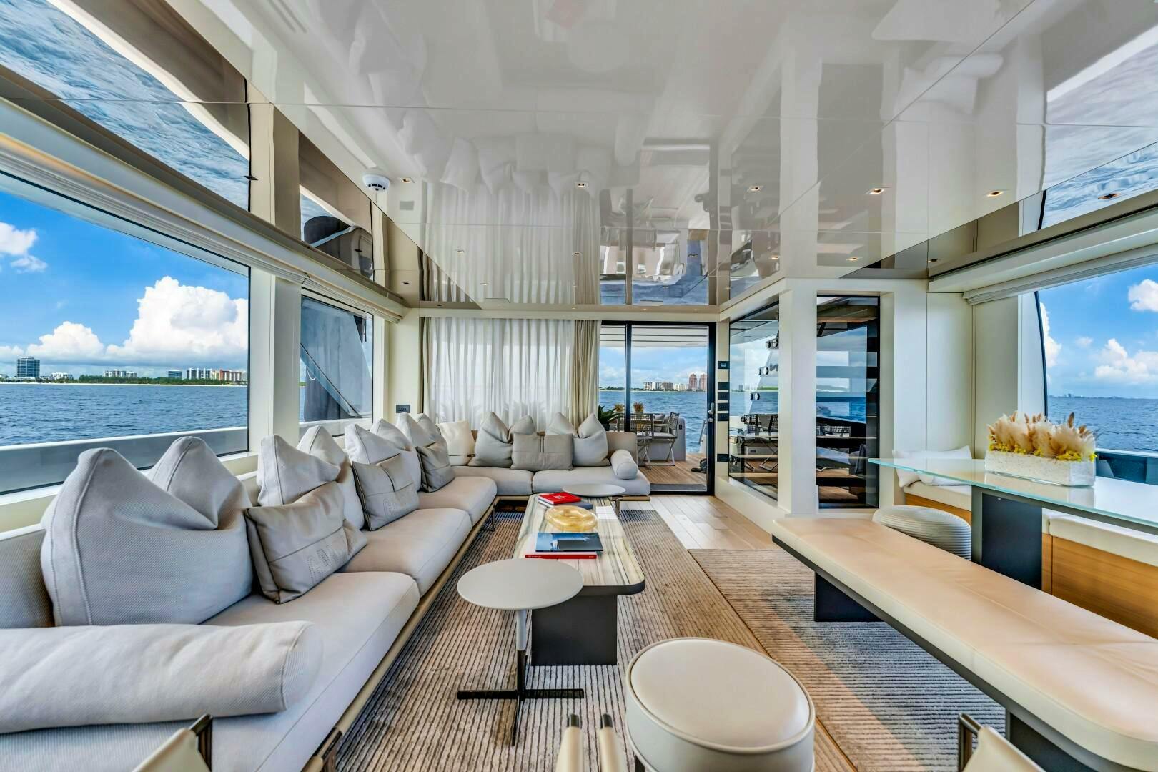 Entering the main salon through the port-side sliding door, you step into a spacious, beautifully appointed interior. A large L-shaped sofa to starboard creates a comfortable lounge area, accompanied by two modern loose chairs and a coffee table. To port, the dining area is positioned to maximize space and natural light. A wall-mounted television is seamlessly integrated behind a mirrored glass panel, while built-in storage along the port side discreetly houses guest amenities. Expansive windows to port, starboard, and aft, flood the space with natural light, enhancing the inviting ambiance.