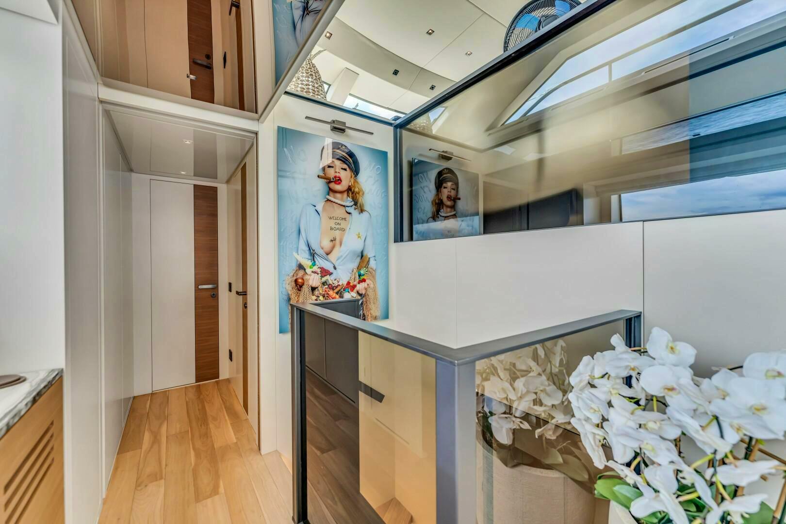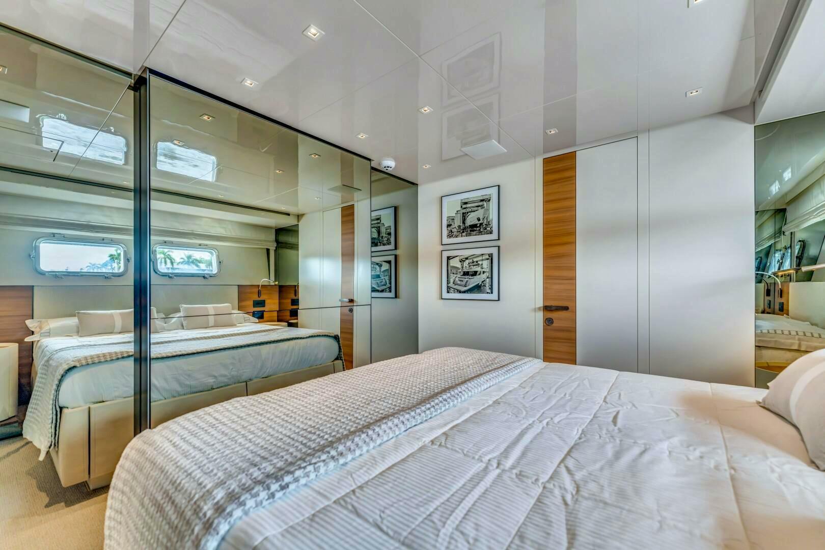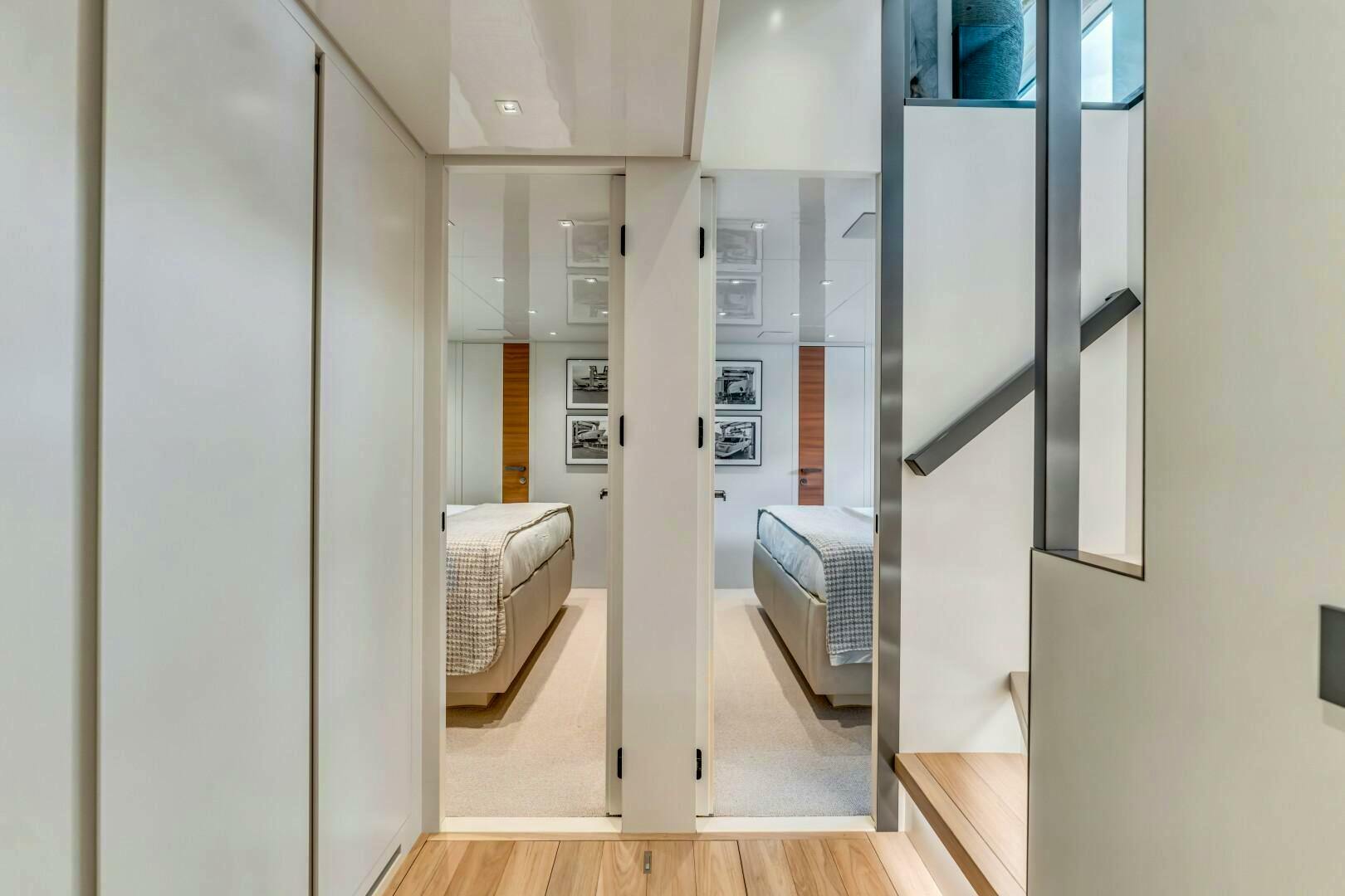 Returning to the port corridor outside the master suite, additional wall storage is available. Descending the staircase leads to the lower guest accommodations. Aft, two mirrored queen cabins offer refined comfort, each featuring hidden televisions, nightstands, natural light from portholes, and en-suite bathrooms with marble and glass showers. Forward, the VIP queen cabin offers the same luxurious amenities as well as a built-in desk. A sliding pocket door to starboard opens to a spacious en-suite bathroom with a marble shower, custom seat, and porthole.