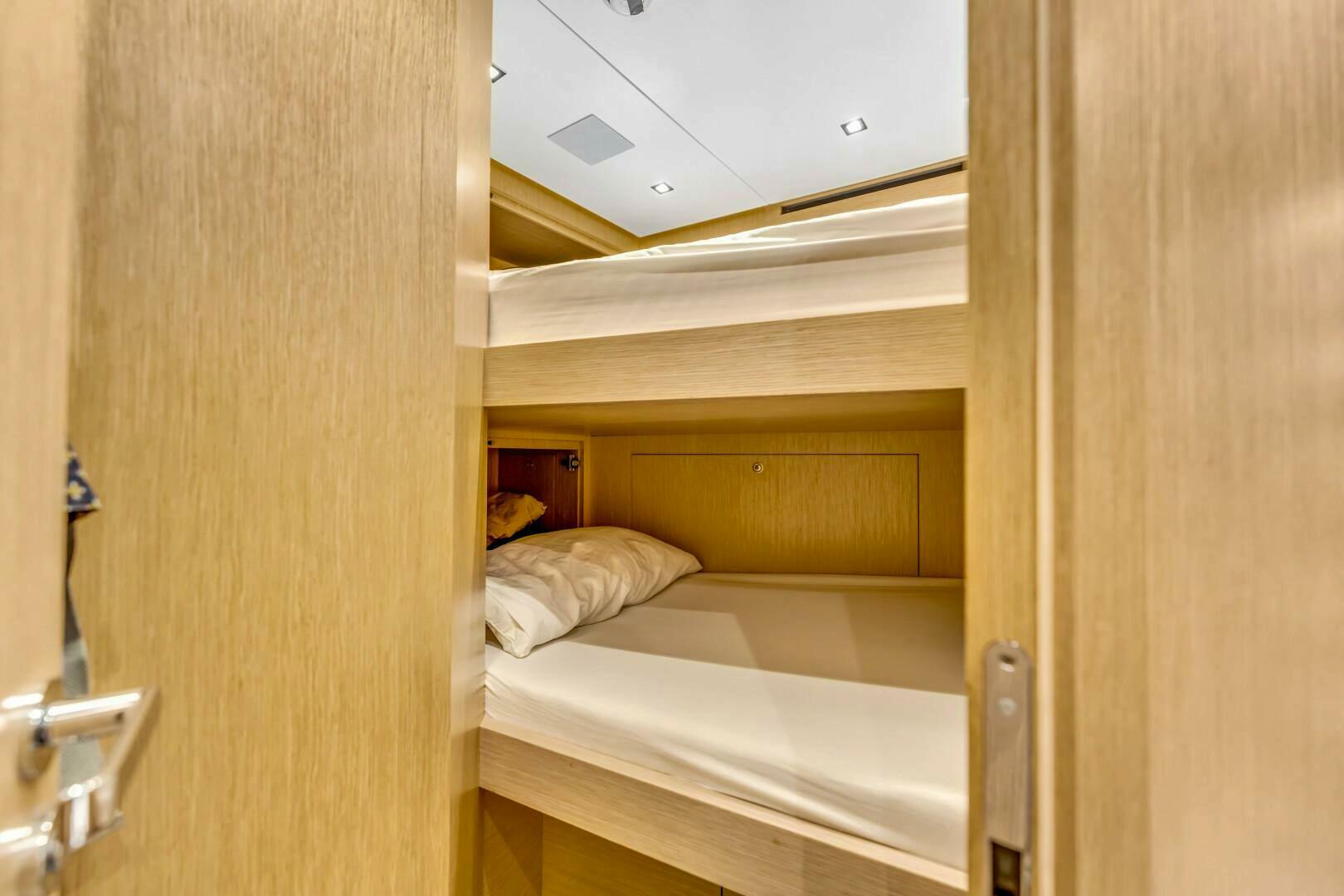Descending a staircase forward of the galley, the crew quarters are designed for functionality and comfort. Two crew cabins—one to starboard, one to port—are fitted with over/under single berths and portholes, each featuring dedicated en-suite bathrooms with access located just outside the cabins. A stacked washer and dryer are conveniently positioned outside the port crew cabin. Further forward, the crew mess includes built-in seating around a table for four, providing a comfortable space for dining and downtime.