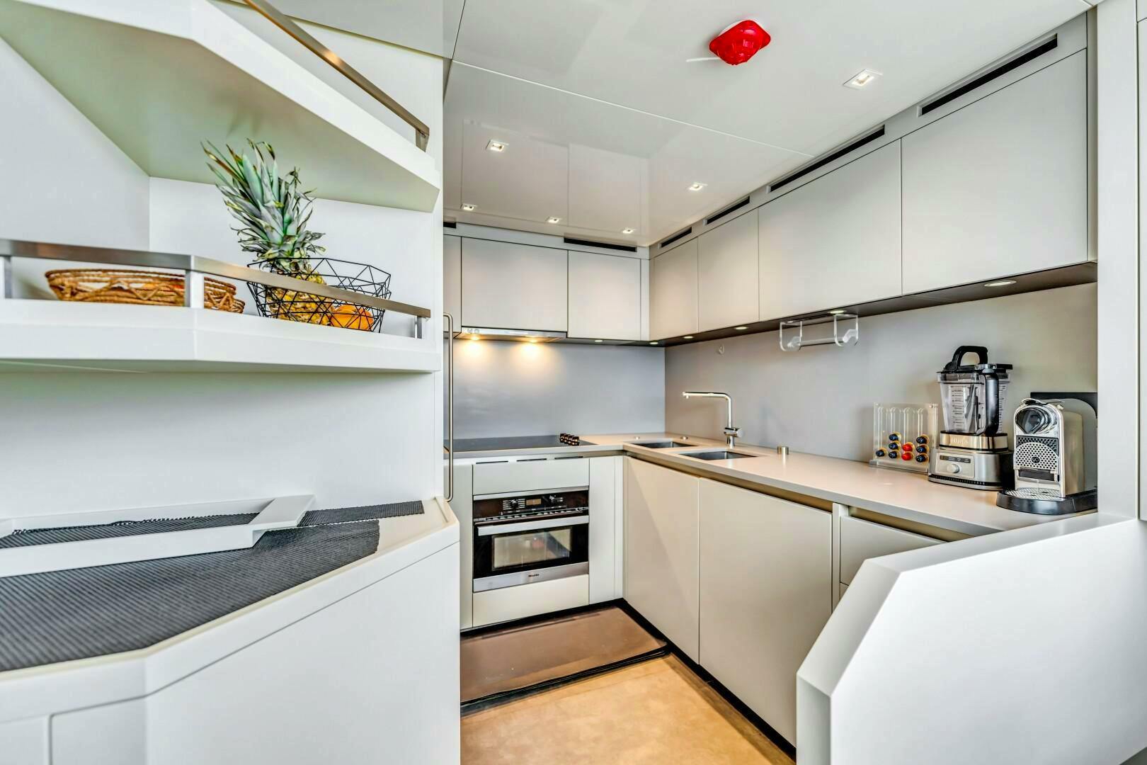 Back in the main salon, moving forward to starboard, you pass a staircase leading up to the pilothouse as well as wall storage for china, flatware, and stemware. Through a hinged door, the galley is a chef’s dream, equipped with high-end Miele appliances, generous counter space, refrigeration, and storage. A starboard-side door provides convenient access to the exterior deck.