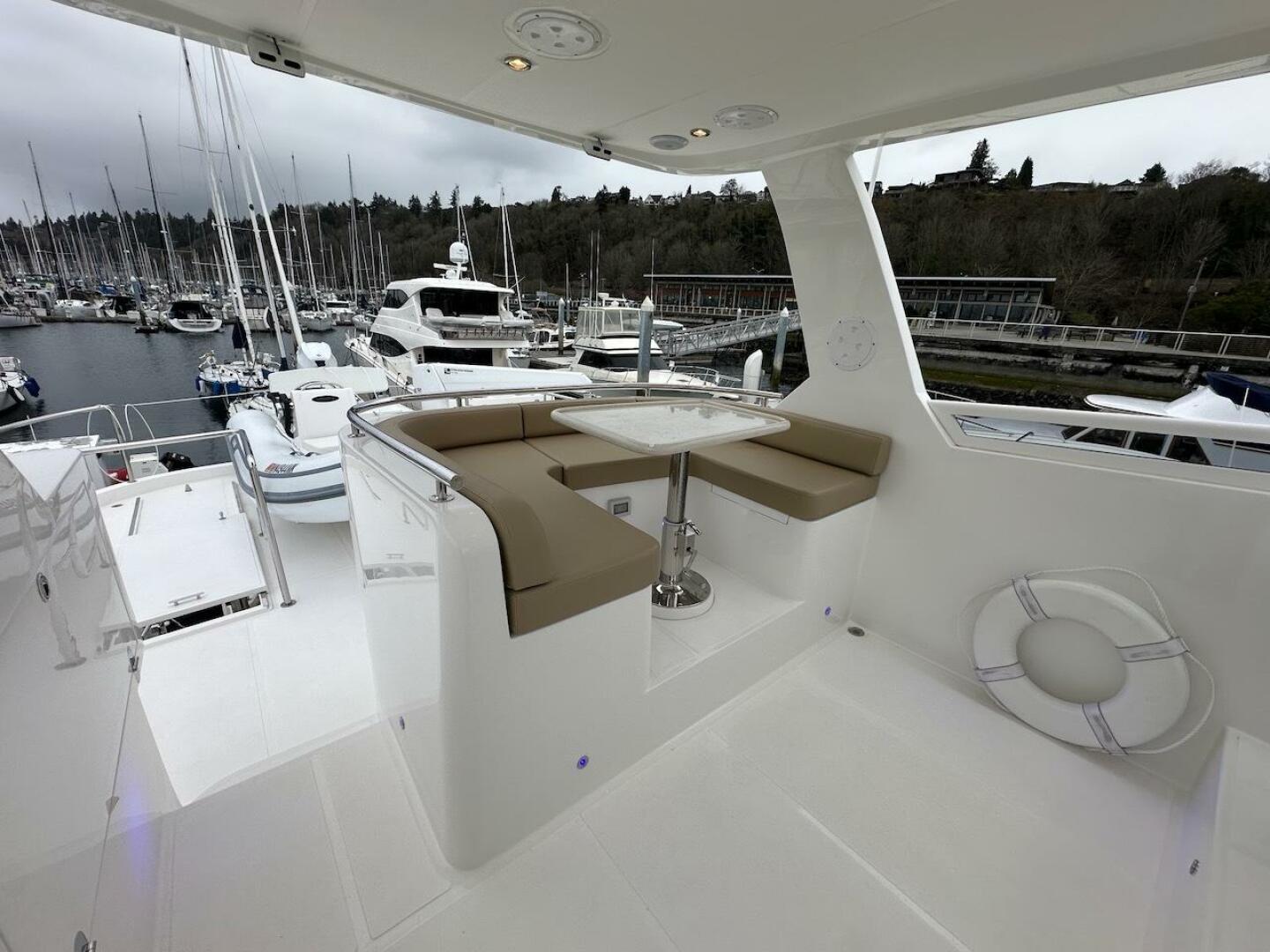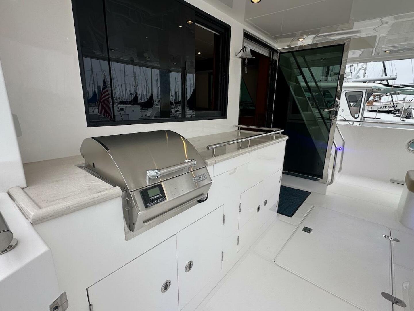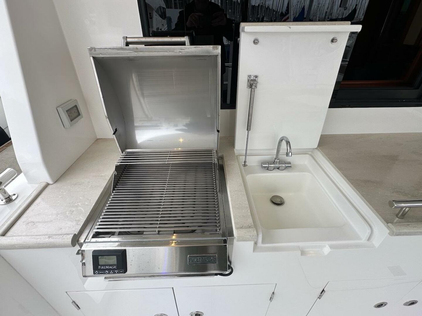 - Aft cockpit cabinet with solid surface counter top, stainless sink, and extendable hot & cold sprayer