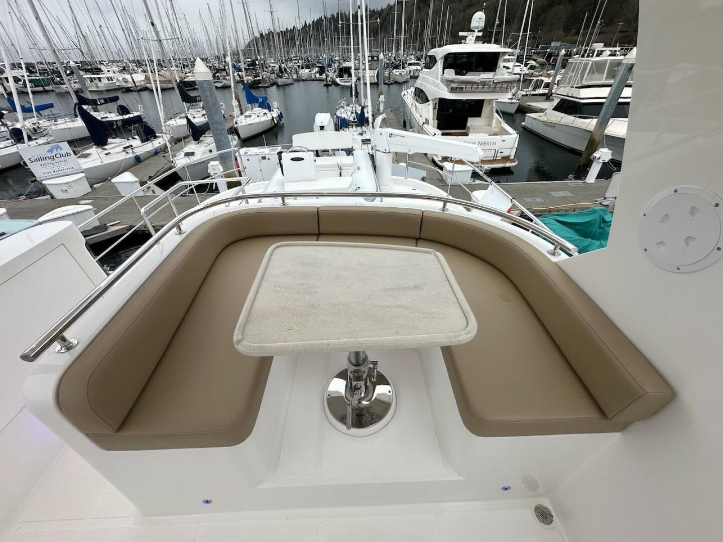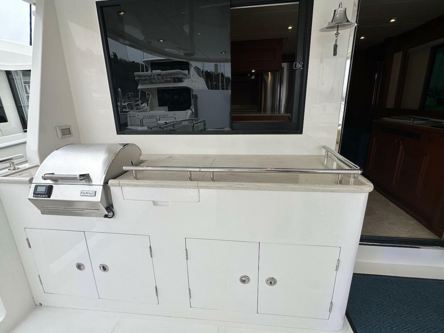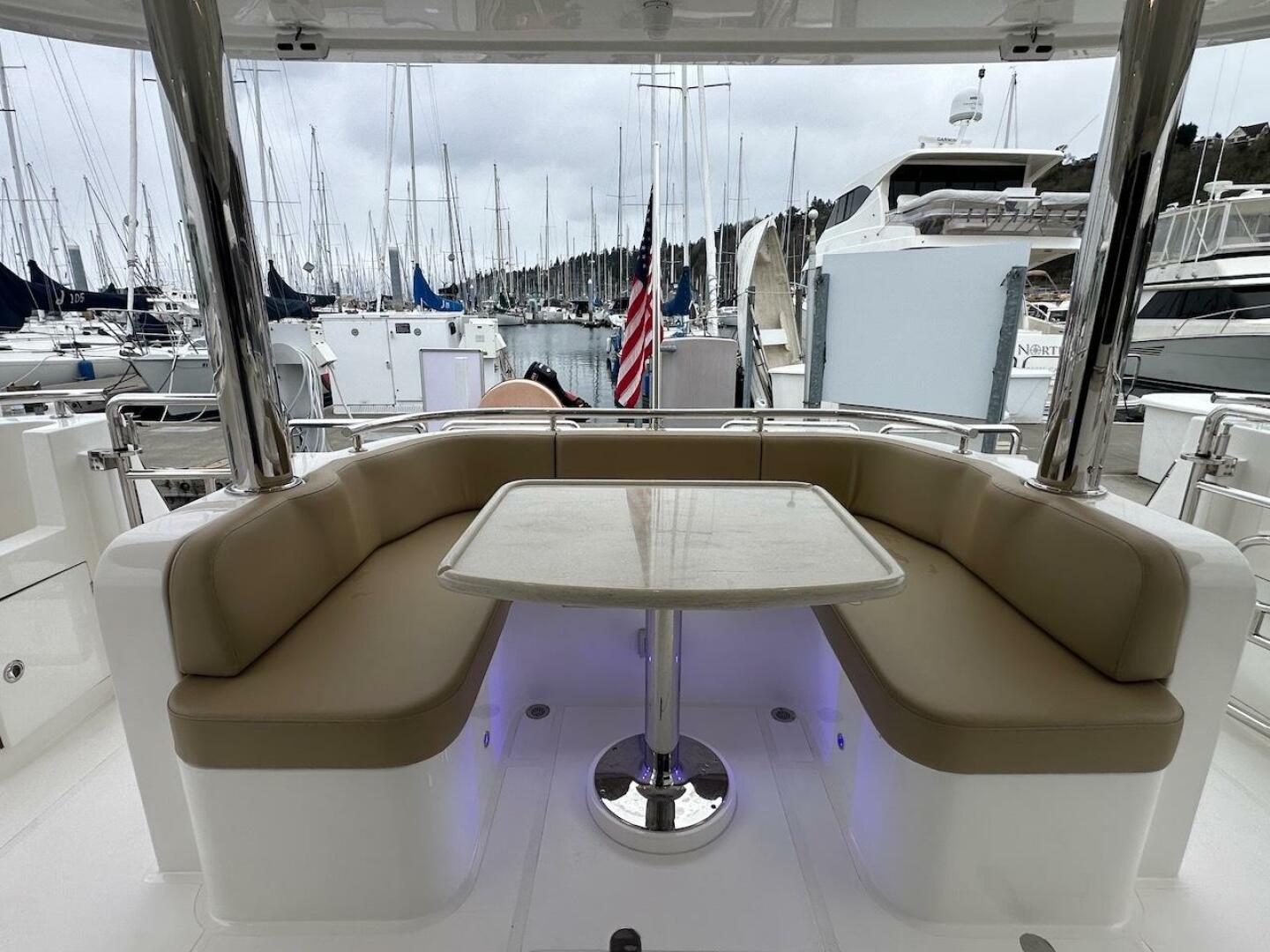 - Aft cockpit cabinet with solid surface counter top, stainless sink, and extendable hot & cold sprayer