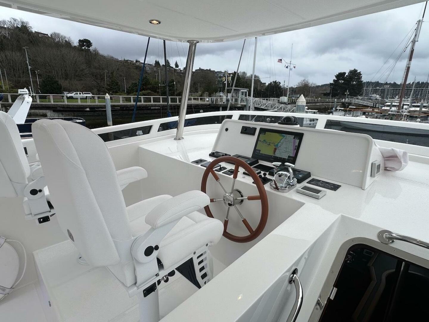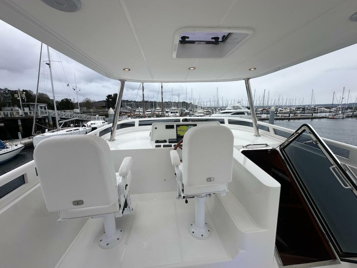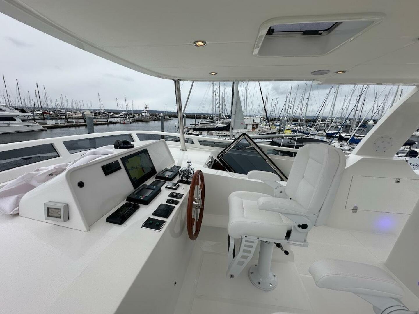 - Helm chairs - 2 x Pompanette captain's chairs in white vinylester, with foot rests, and custom Sunbrella white covers
