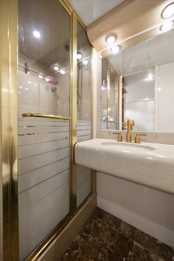 The upper berth could easily be re-installed to accommodate two guests. The guest head features mocha marble floors, a molded Corian counter, a large sink, a spacious Corian stall shower, a toilet, and adequate storage space overhead in a cabinet and beneath the counter.